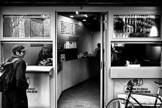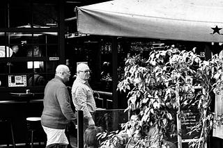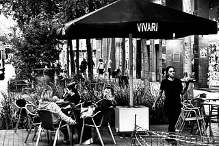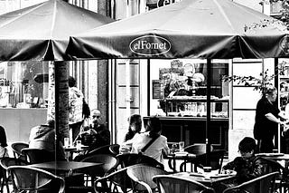 Monochrome Street Photography: Capturing Café Life and Shadow Play at El Fornet Patio