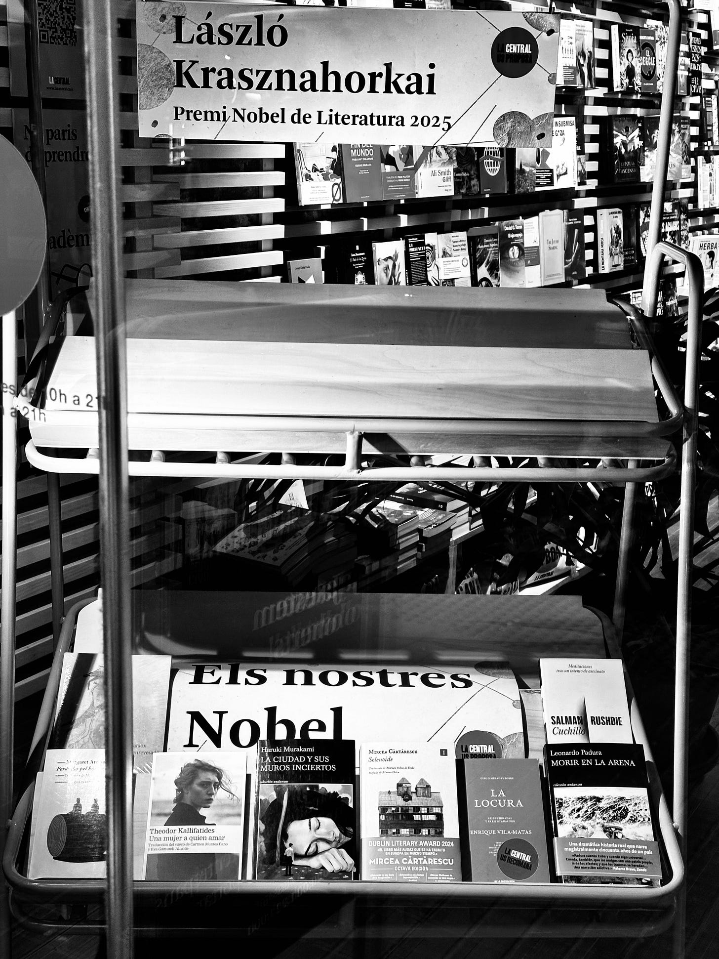 A striking black-and-white photograph captures a promotional book display in a Barcelona bookstore, celebrating the world’s literary elite. Titled “Els nostres Nobel” (Our Nobels in Catalan), the curated shelf features perennial contenders like Haruki Murakami, Salman Rushdie, and others.