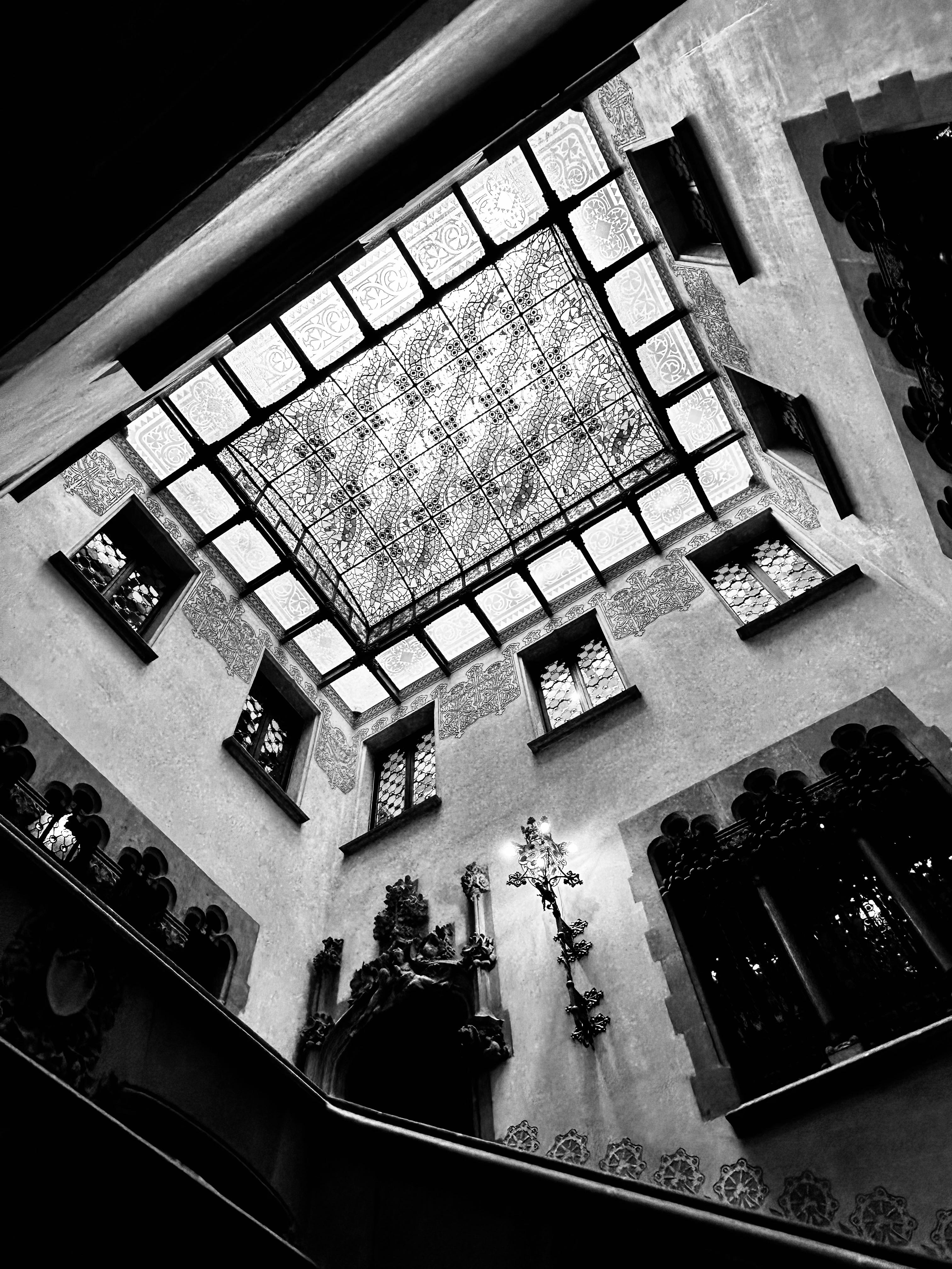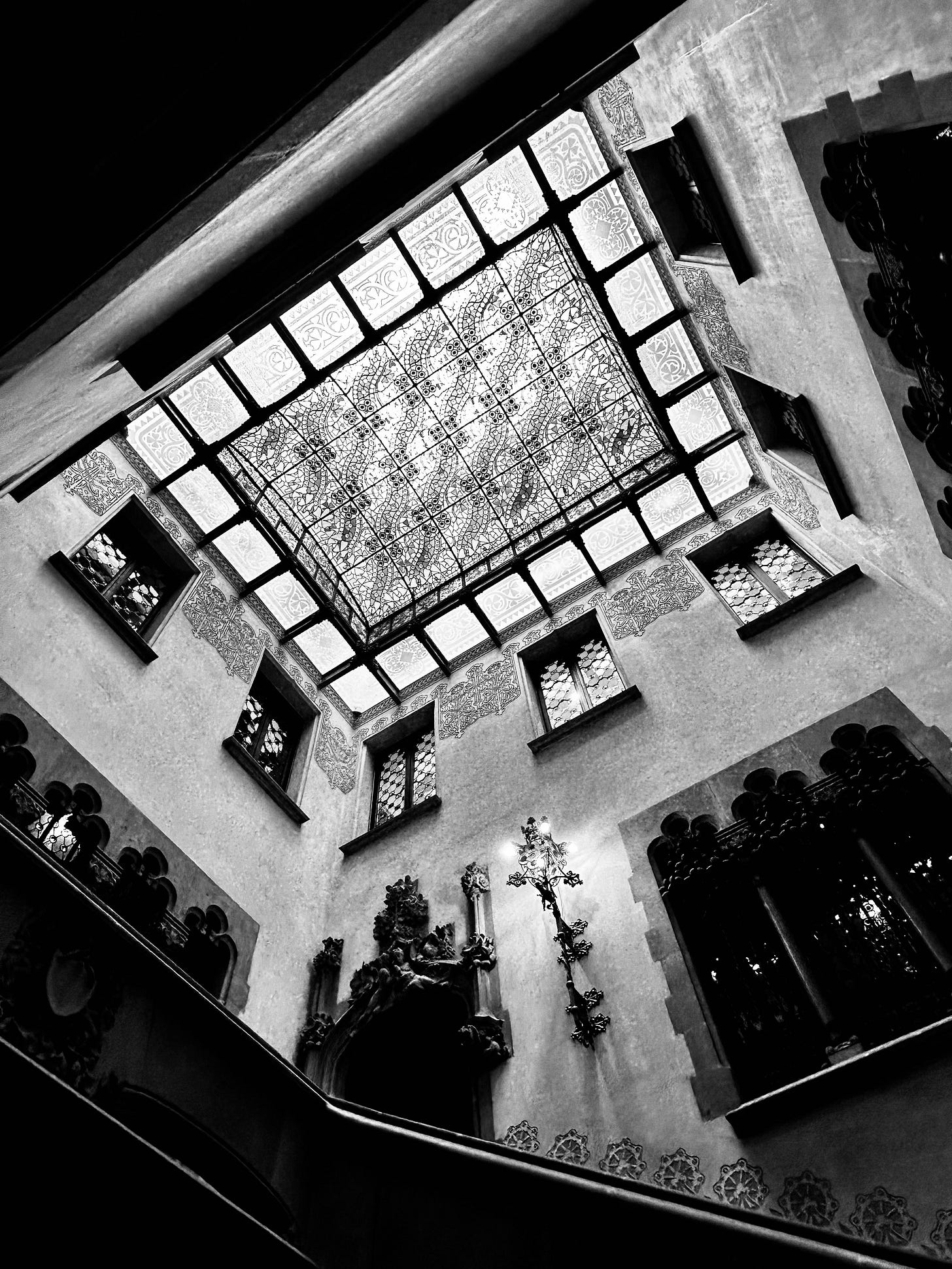 Shot from the vantage point of the interior staircase, the eye is immediately drawn upward. The walls rise dramatically, receding into the darkness, making the overhead stained-glass skylight appear like a crowned jewel. Rendered in sharp black and white, the ornate, lacy pattern of the glass ceiling is emphasised—it’s not just a window, but a massive, delicate textile woven in glass and iron, designed to filter the strong Mediterranean sun into a soft, textured glow.