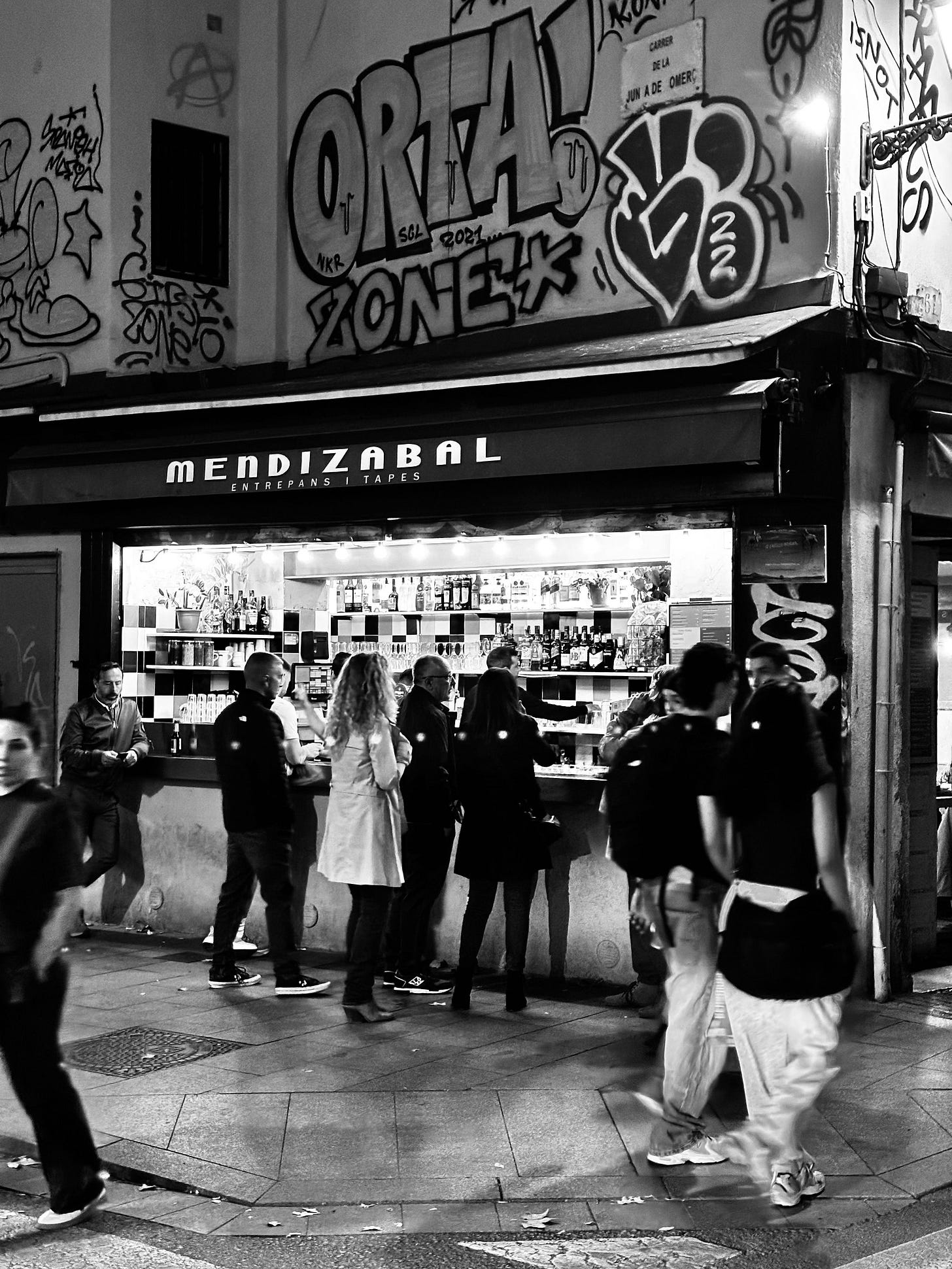 The Raval district in Barcelona is a place of raw, immediate energy, where historic facades serve as the canvas for contemporary street culture. This photograph captures that unique intersection outside Mendizabal, a popular spot for entrepans (sandwiches) and tapes (tapas).