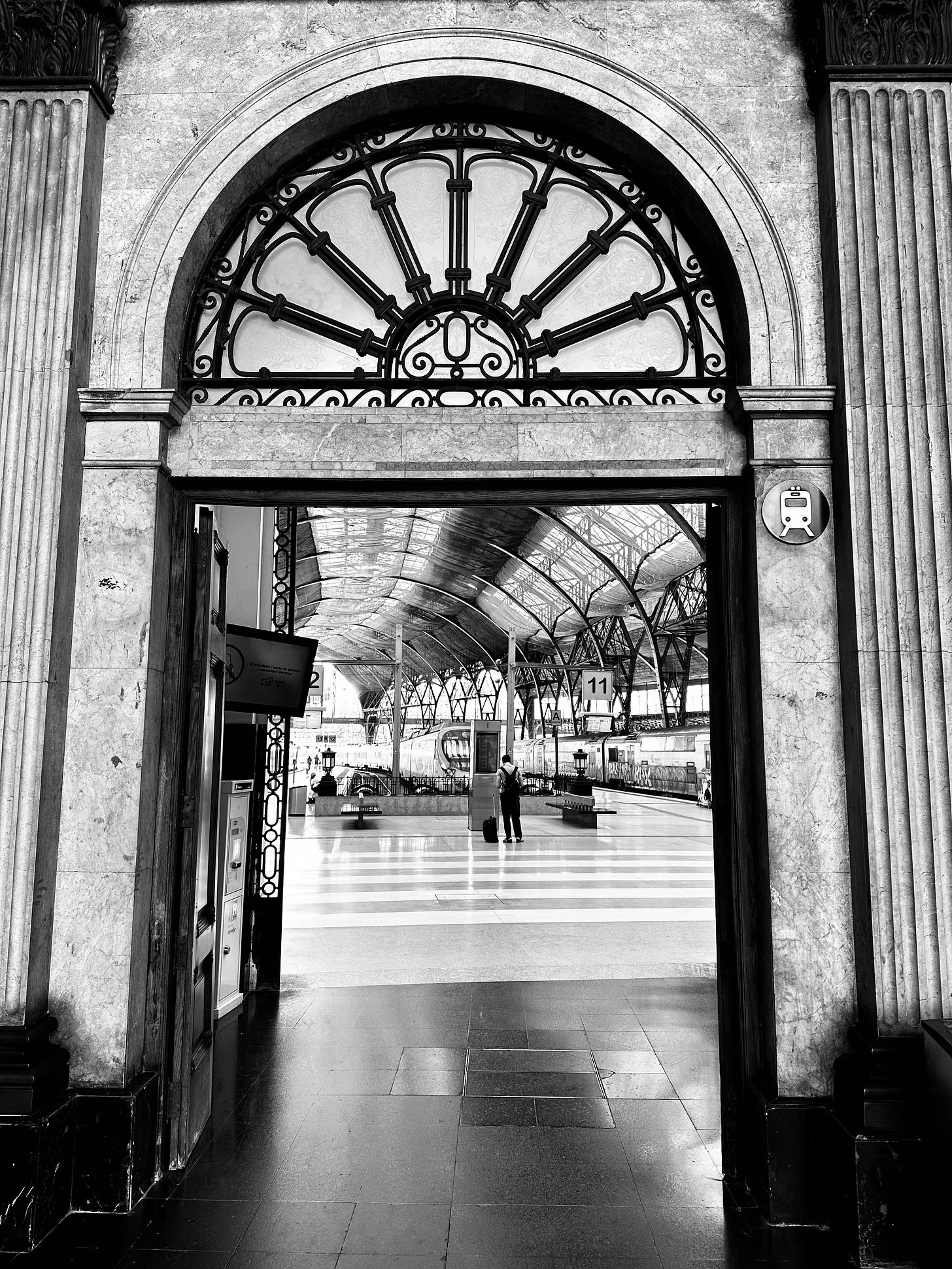 his black-and-white photograph provides a striking view from an interior hall of Barcelona's Estació de França into the main train shed. The viewer's eye is framed by a grand, arched stone doorway with two massive, fluted columns. The top of the arch features an ornate, semi-circular ironwork and glass design, a beautiful example of Art Nouveau.