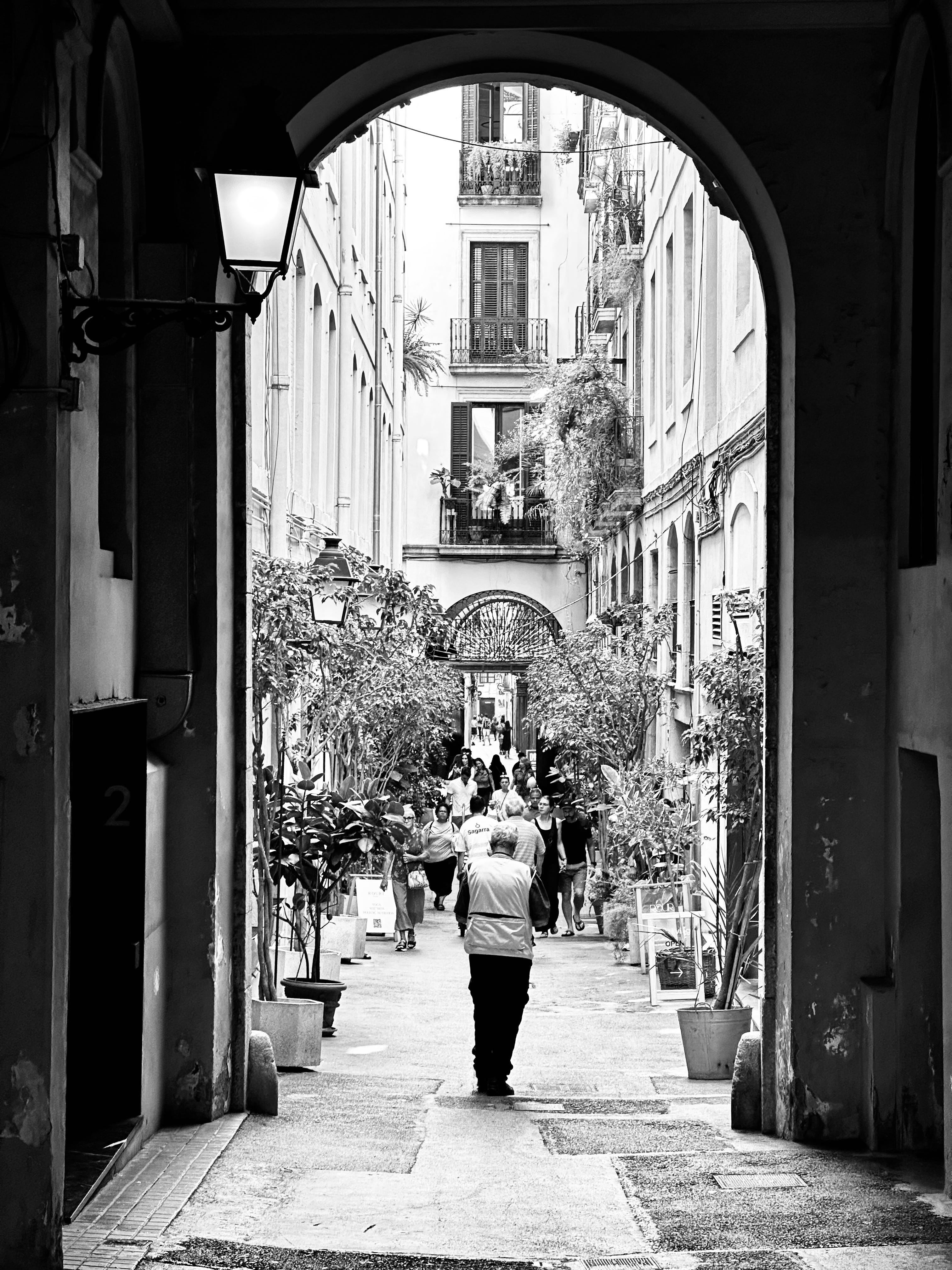 Step through the archway and into a quieter Barcelona. This photo, taken in the heart of the city, captures a tucked-away passage where old buildings lean in, trees line the path in mismatched pots, and life slows to a walking pace. A man walks away from the camera, solitary in the frame yet surrounded by the quiet bustle of daily life. Black and white …