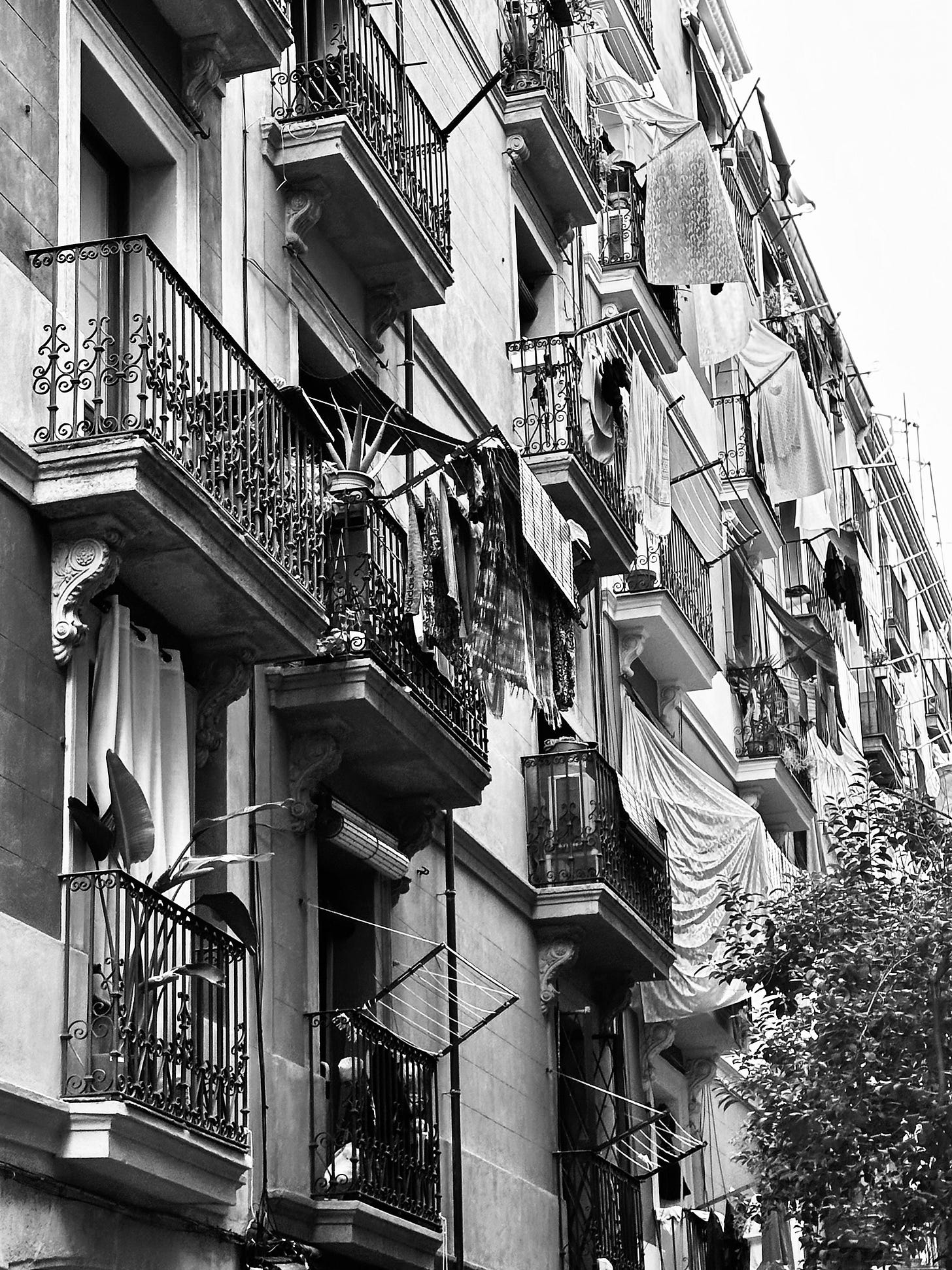This black-and-white photograph captures a vertical slice of a classic residential building in Barcelona. The perspective is from below, looking up at the multi-story facade. A sense of everyday life is immediately apparent, as numerous lines of laundry hang from the ornate balconies, fluttering in the air. The sheets, shirts, and other clothes add a hu…