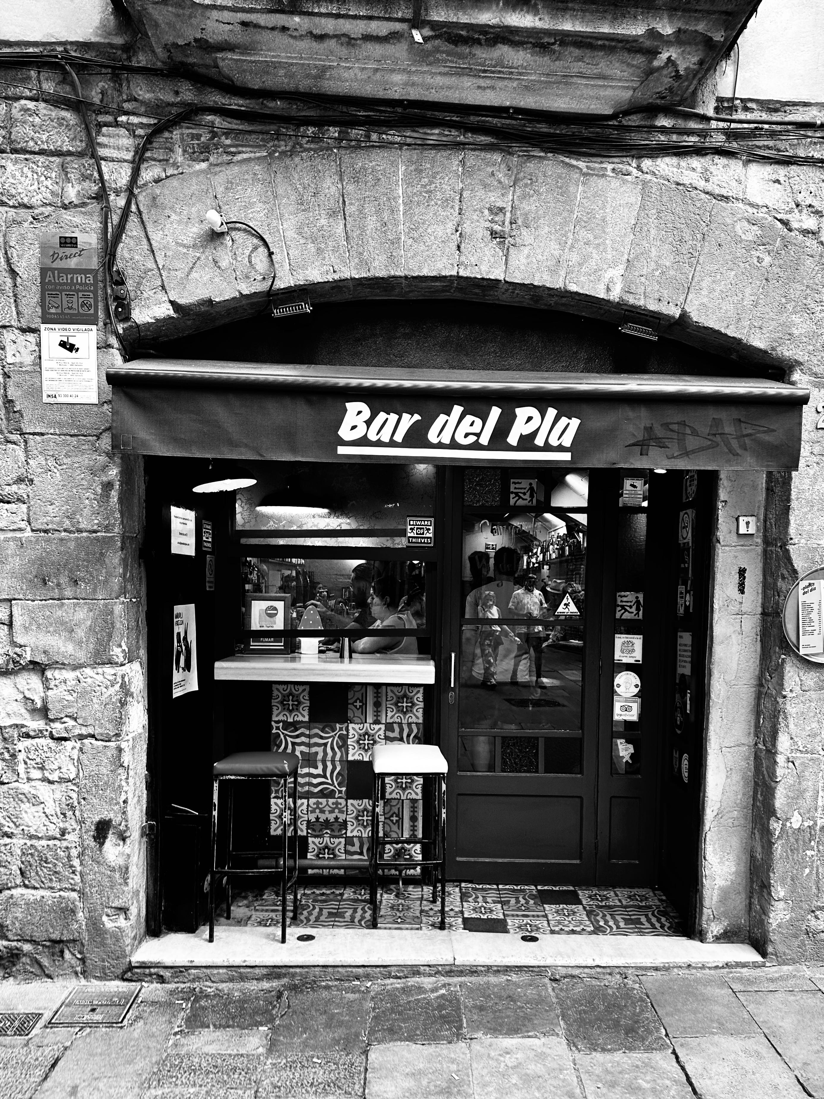 Barcelona, a city celebrated for its vibrant culture and artistic flair, often reveals its truest colours even in shades of grey. This inviting monochrome photograph captures a lively coffee shop or cafe, with its outdoor seating area bustling with patrons.