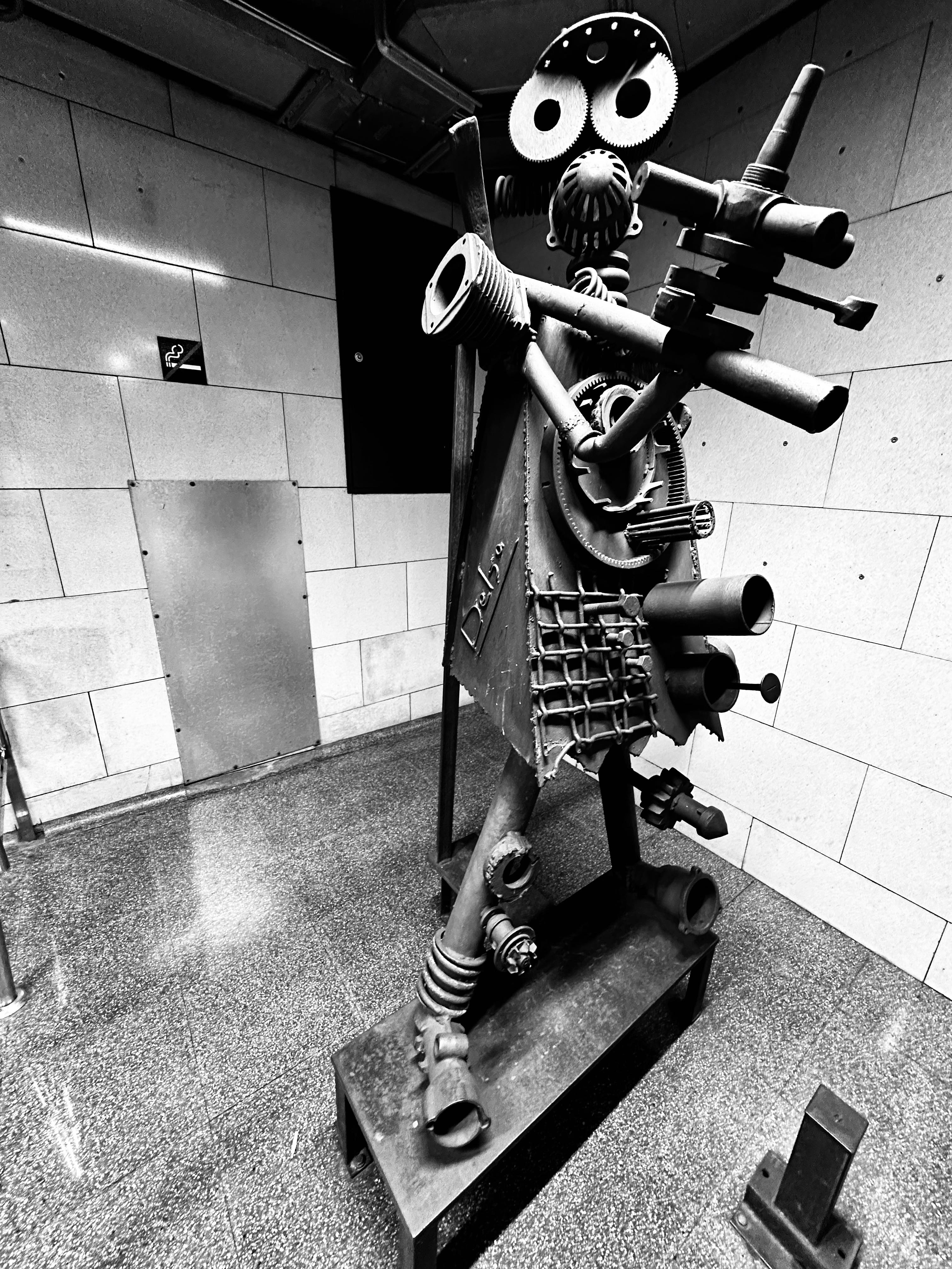 This striking black and white photo captures a fascinating piece of industrial-style sculpture, which I now know is part of the art found within the Barcelona metro. Crafted from an assortment of gears, pipes, and metal components, it has a distinctly mechanical, almost robotic feel. The monochrome treatment really emphasises the textures and forms, giv…