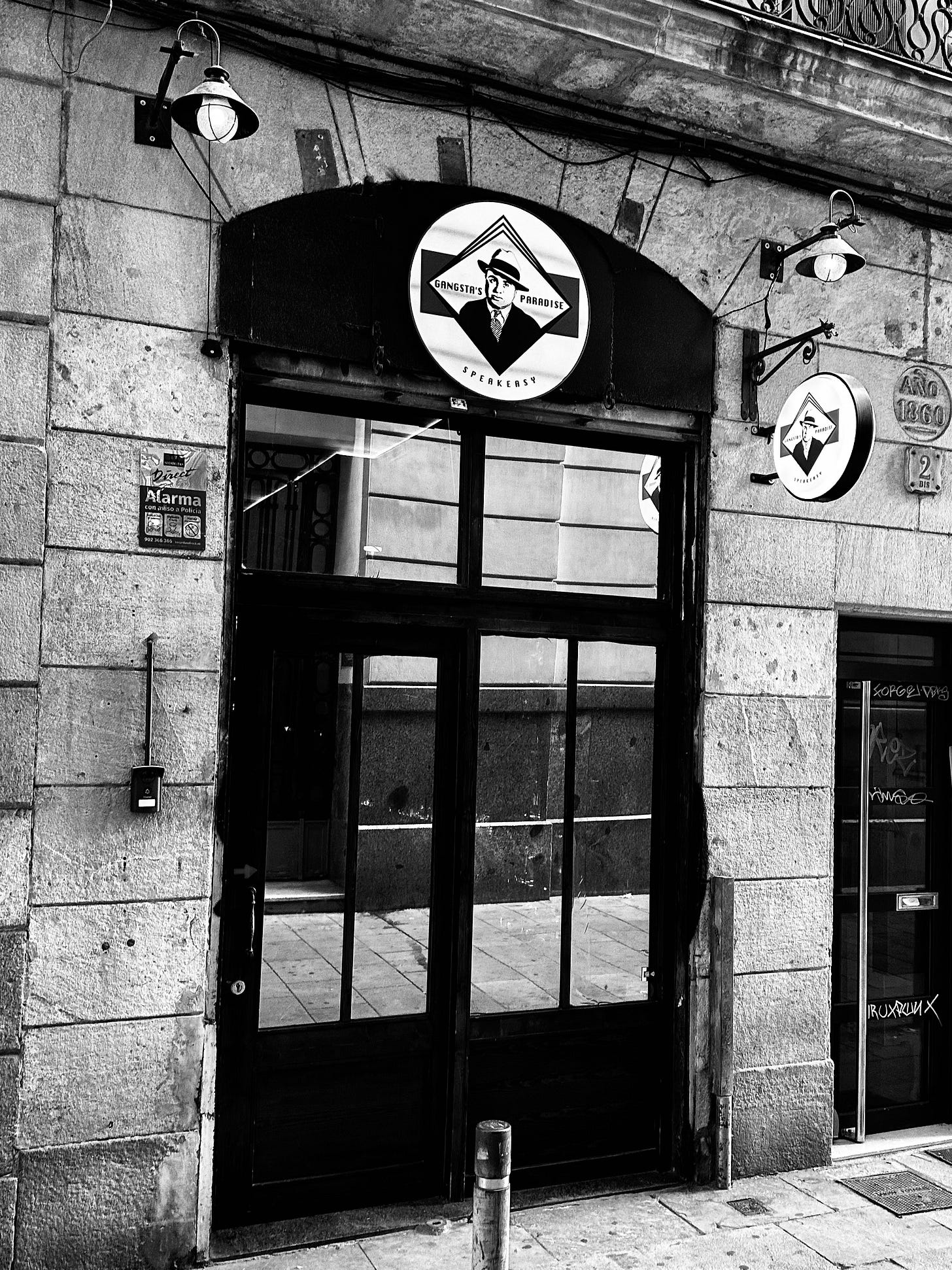 This intriguing black and white photograph captures the facade of what appears to be a unique establishment in Barcelona, possibly a speakeasy or a themed bar, given the "SPEAKEASY" text on the circular sign. The main entrance, with its multi-paned glass doors, is framed by sturdy stone blocks, hinting at a classic architectural foundation. Two distinct…