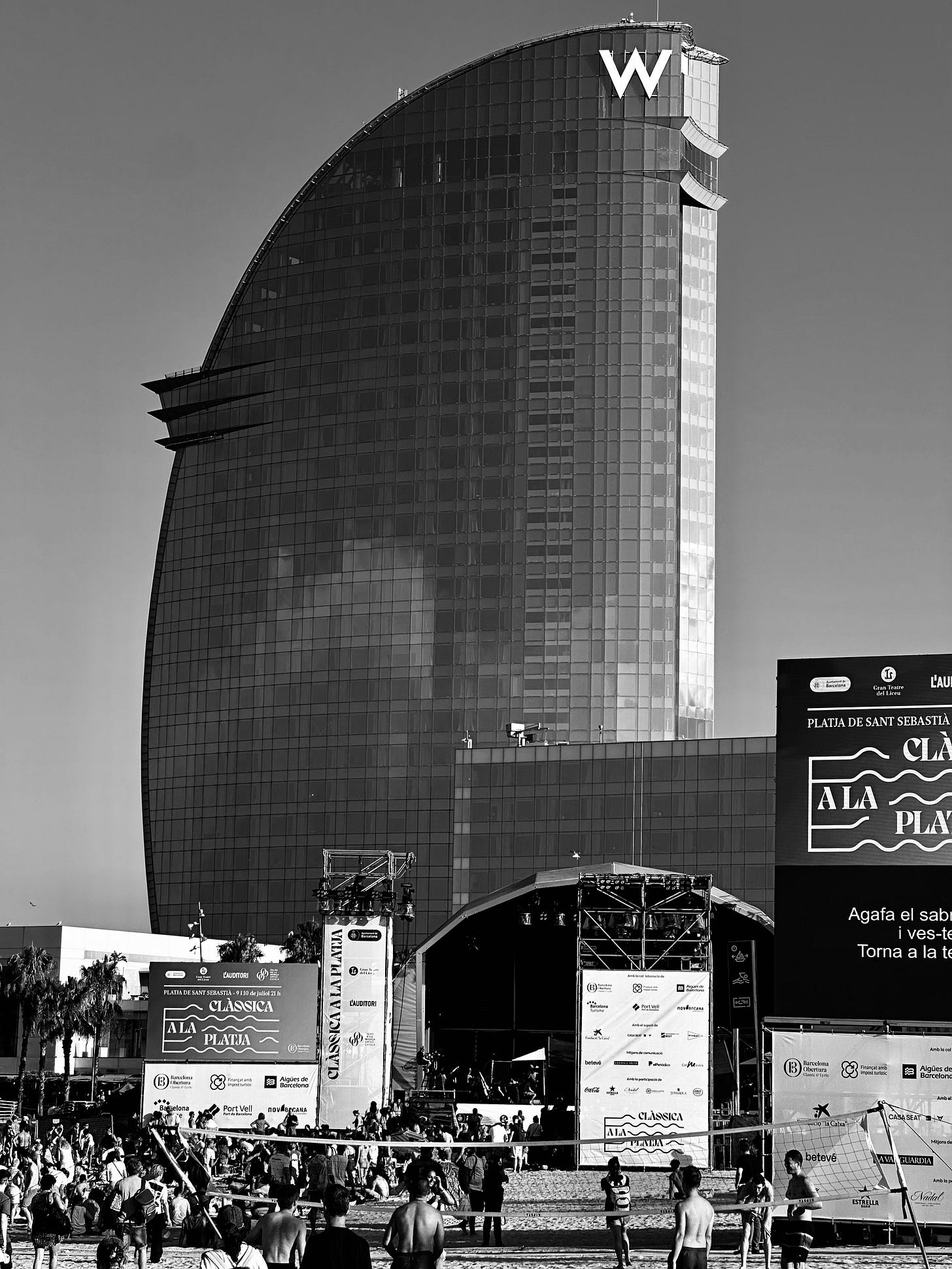 This impressive black and white photograph perfectly captures the iconic W Barcelona Hotel, often referred to as the "Hotel Vela" (Sail Hotel) due to its distinctive shape. Rising majestically against the sky, the hotel's sleek, curved facade dominates the background. In the foreground, the bustling atmosphere of the beach comes alive with a large stage…