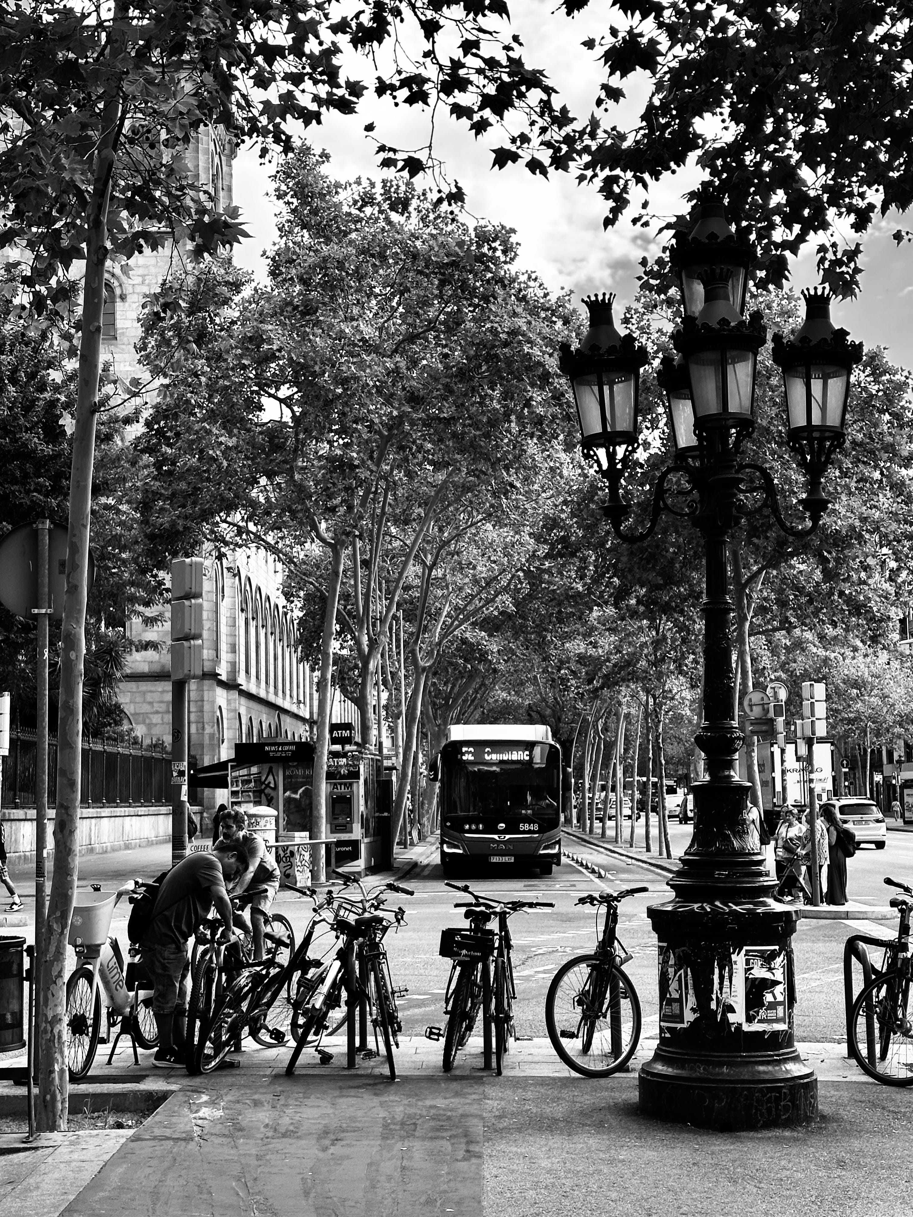 This black-and-white photograph captures a street scene in Barcelona, with a strong focus on urban transportation. A group of bicycles is visible in the foreground, parked along the sidewalk and a designated bicycle lane. A prominent, ornate streetlamp stands on the right, its intricate design contrasting with the more modern elements of the city.