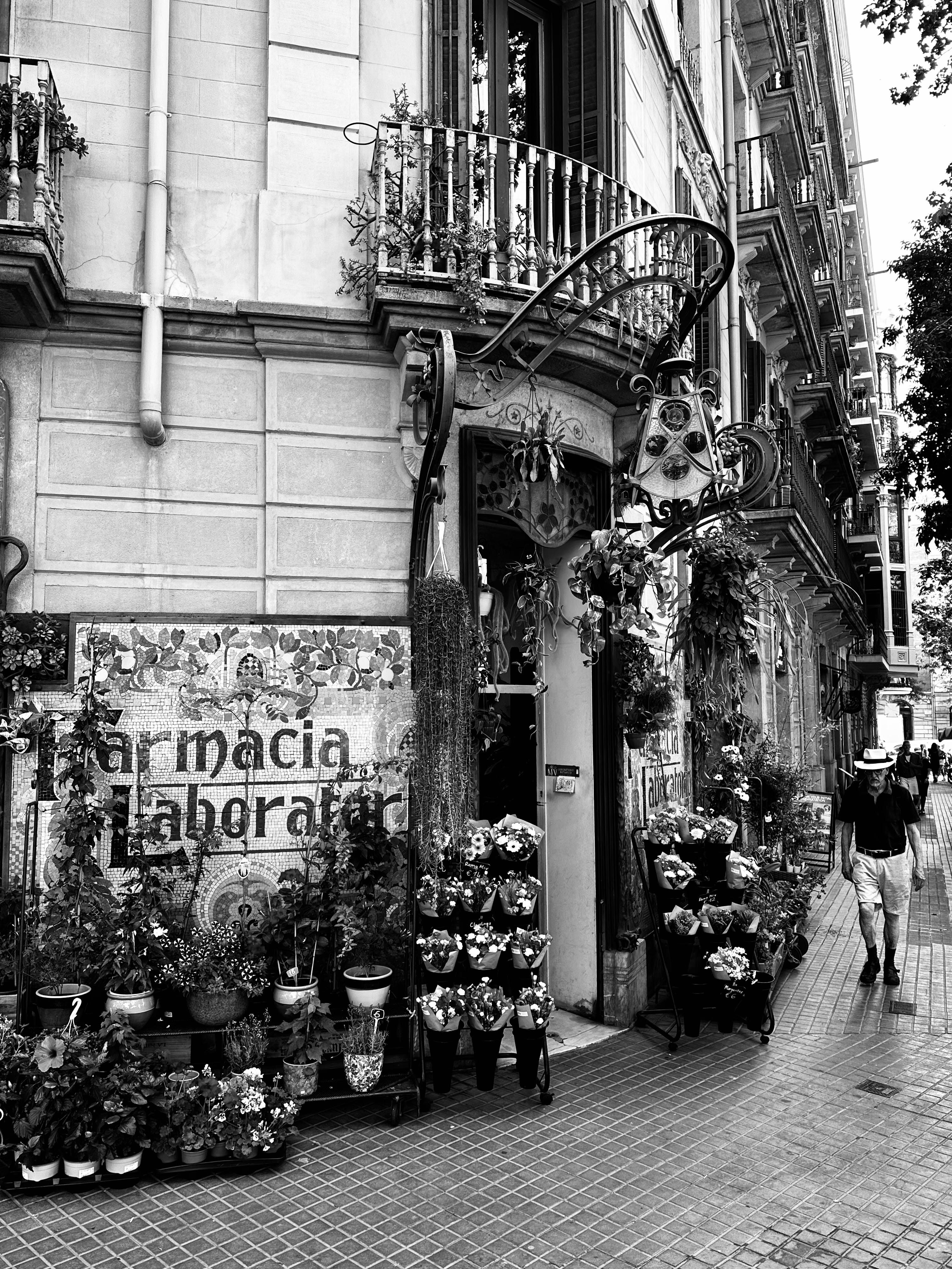 Blooming Corners: A Barcelona Street Scene in Monochrome