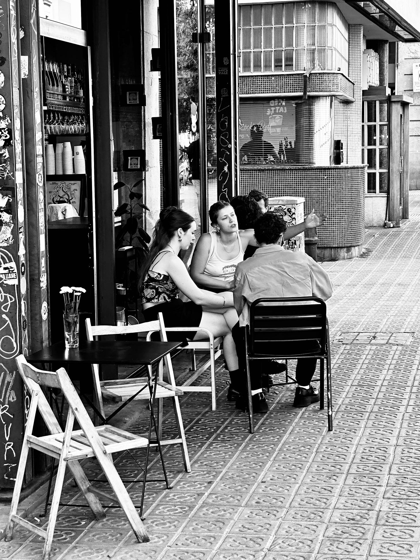 Barcelona, a city celebrated for its vibrant culture and artistic flair, often reveals its truest colors even in shades of gray. This intimate monochrome photograph captures a candid moment at an outdoor cafe or restaurant, where people are gathered, engaged in conversation, and enjoying the urban atmosphere.