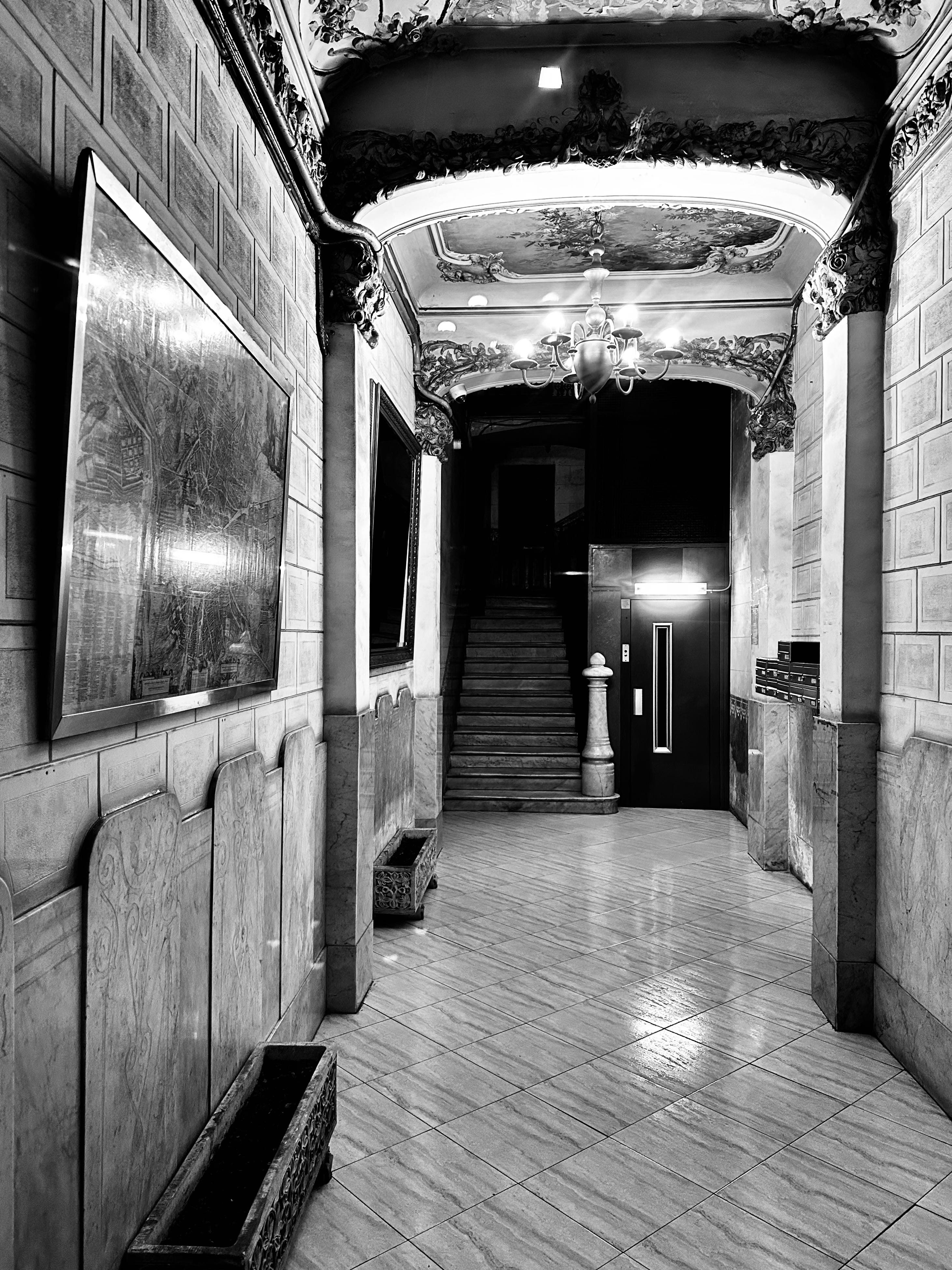This photograph offers a spectacular culmination of Barcelona’s architectural artistry, capturing a grand hallway where every surface is a canvas. The eye is immediately drawn upward to the magnificent painted ceiling and its ornate, sculptural plasterwork, a stunning example of Modernista flair. Below, the walls are panelled with rich marble and decorative tiles, creating a symphony of texture that guides the eye towards the formal staircase and the contrasting presence of a modern elevator. With framed artwork and decorative planters, this hall is more than a passage—it is a preserved gallery of the building’s history and enduring luxury. Join BarcelonaJournal.com in a final, detailed appreciation of the deep, sophisticated elegance found within the city’s residential masterpieces.