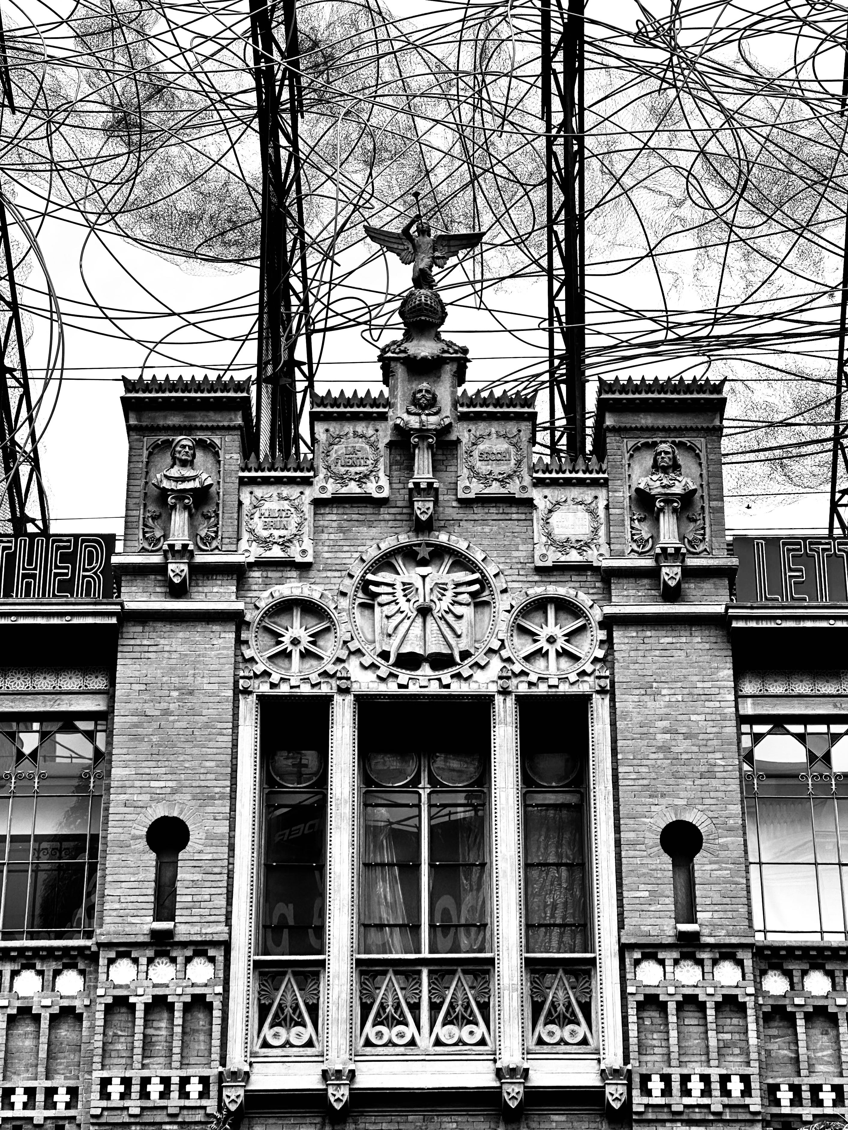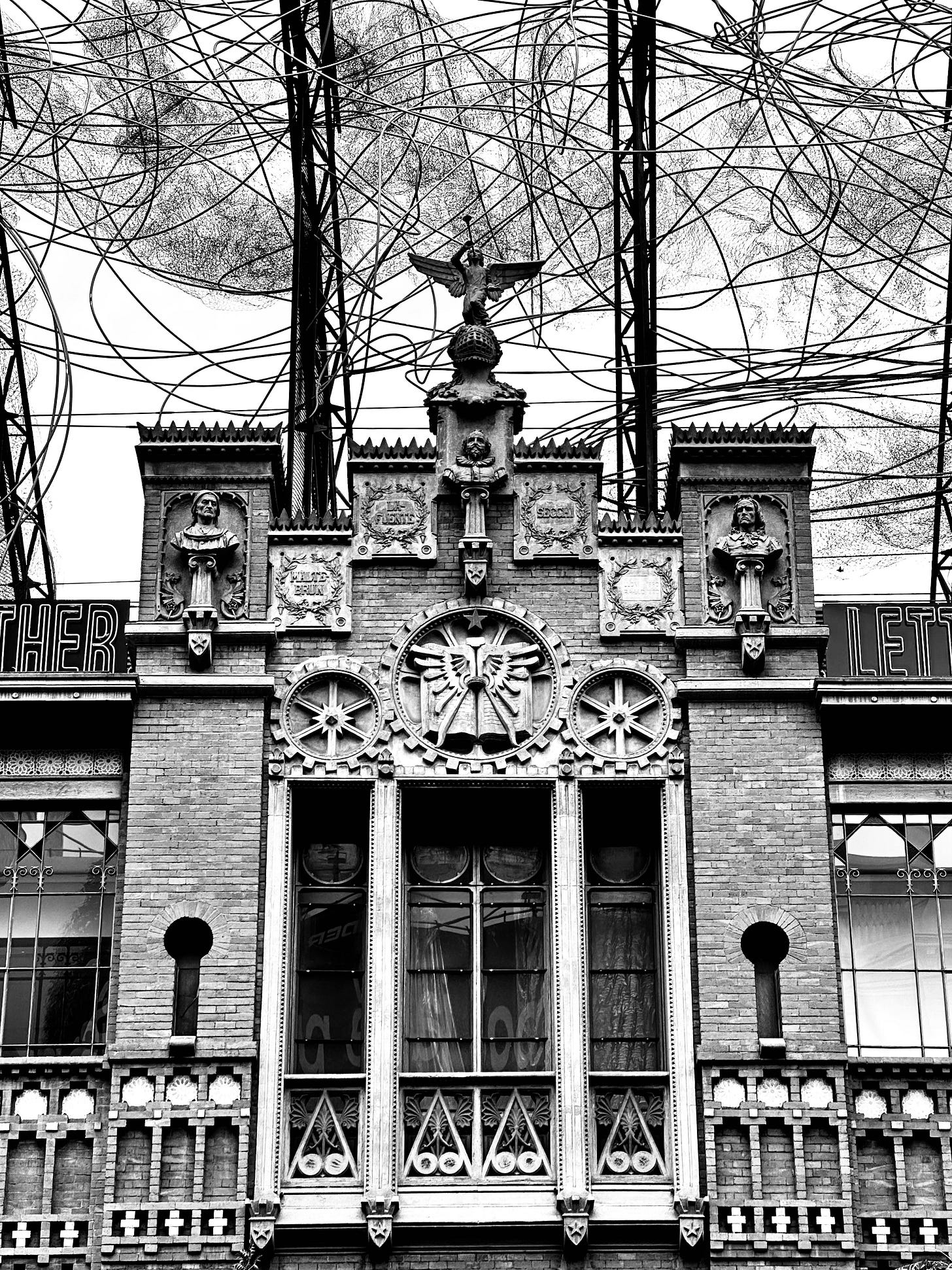 This dramatic black-and-white photo captures the unique facade of the historic Fundació Antoni Tàpies (the former Editorial Montaner i Simon), a masterpiece by Modernista architect Lluís Domènech i Montaner. The brick structure is a testament to industrial artistry, adorned with cog-like wheels, busts, and a soaring winged statue on top—a symbolic vision of early 20th-century progress and intellect. But the true tension lies above. Against the sky, a chaotic, dense tangle of thick industrial cables and metal supports looms over the meticulously ordered architecture. This visual drama highlights the contrast between the idealised craftsmanship of Catalan Modernism and the raw, unkempt infrastructure of the modern city that supports it.