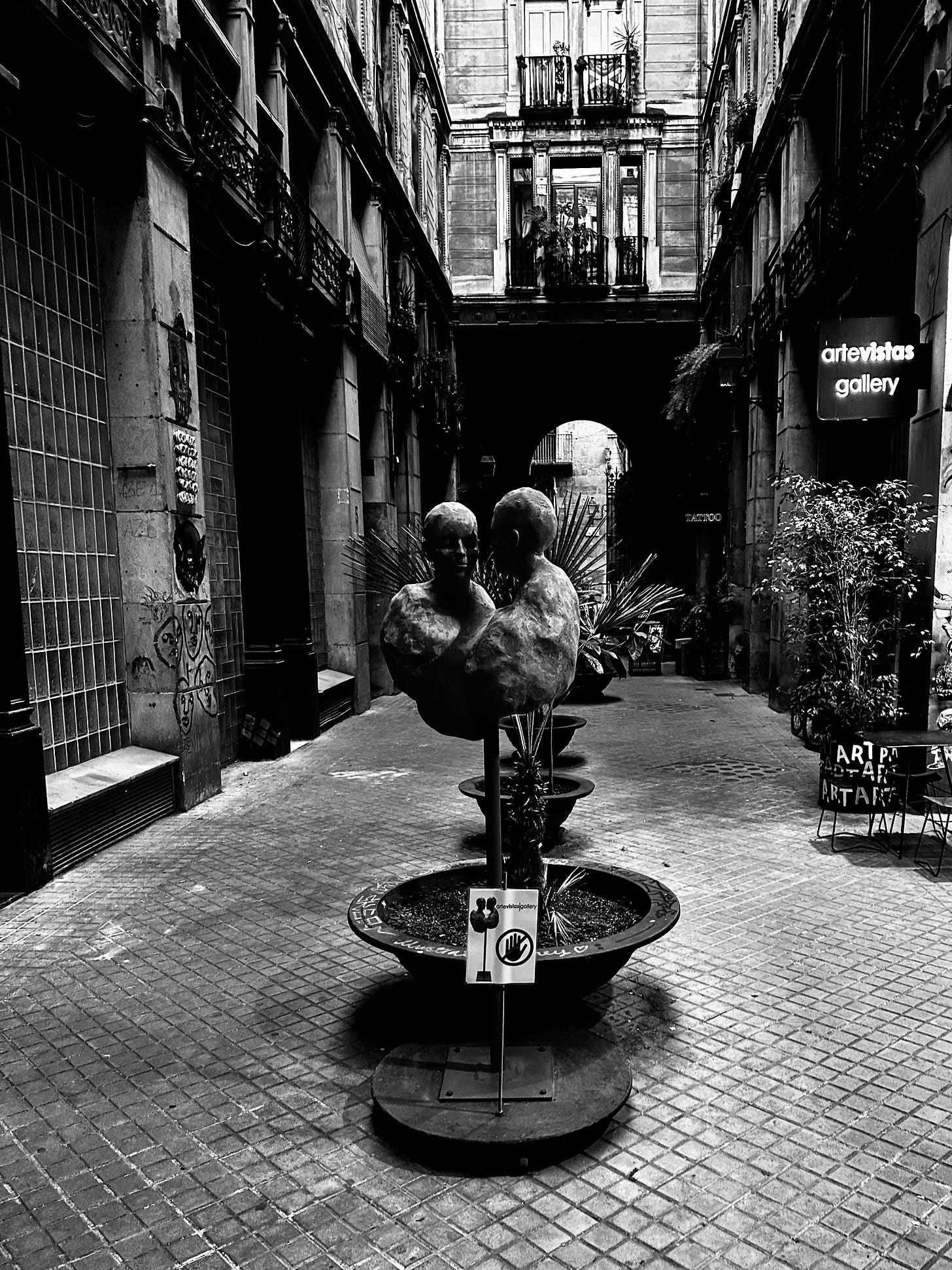 In the heart of a hidden Barcelona passage, modern creativity stands in silent conversation with centuries of history.