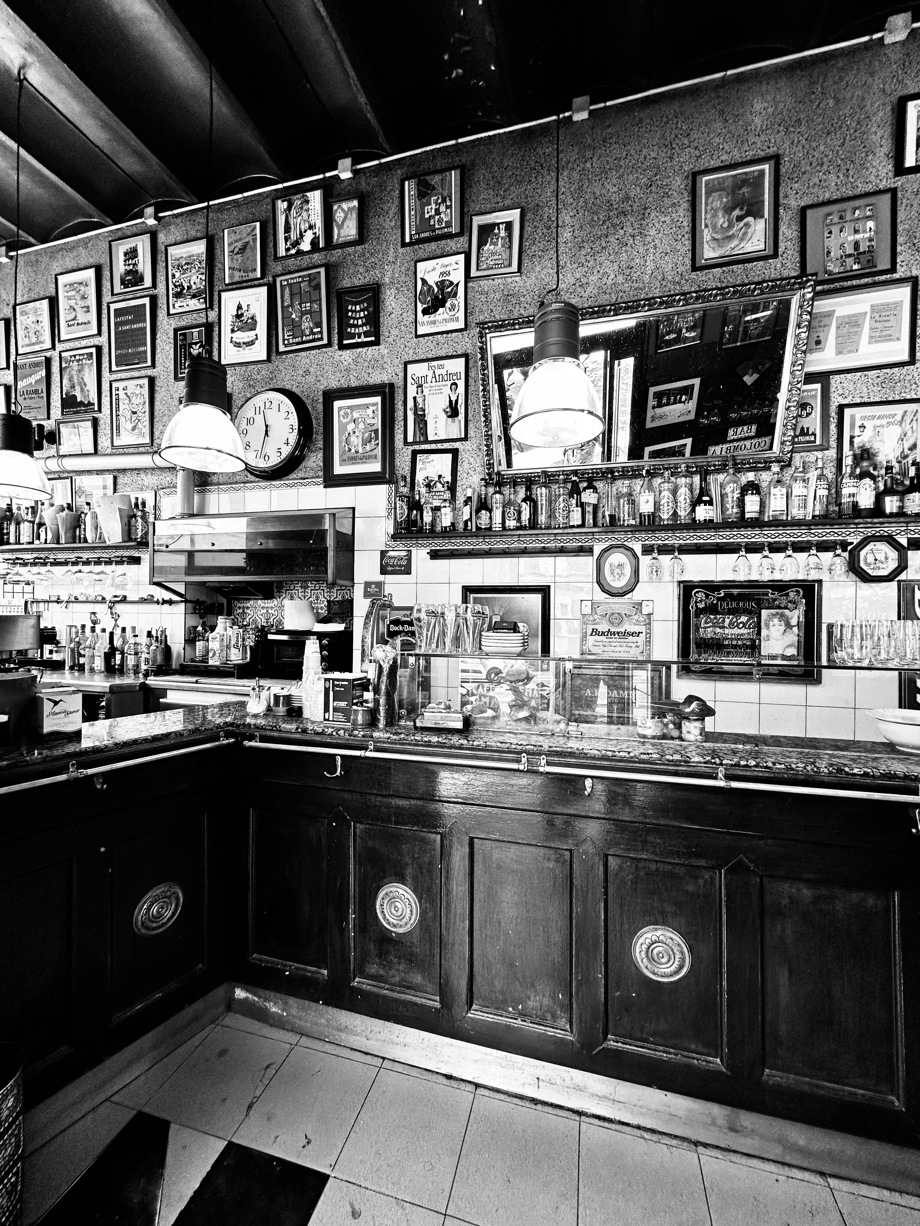 This inviting black and white photograph offers a broader view into the charming interior of a quintessential Barcelona bar. The long, traditional wooden counter dominates the foreground, well-stocked with bottles and glasses. The walls are a rich tapestry of framed pictures, posters, and mirrors, creating a sense of history and countless stories. The t…