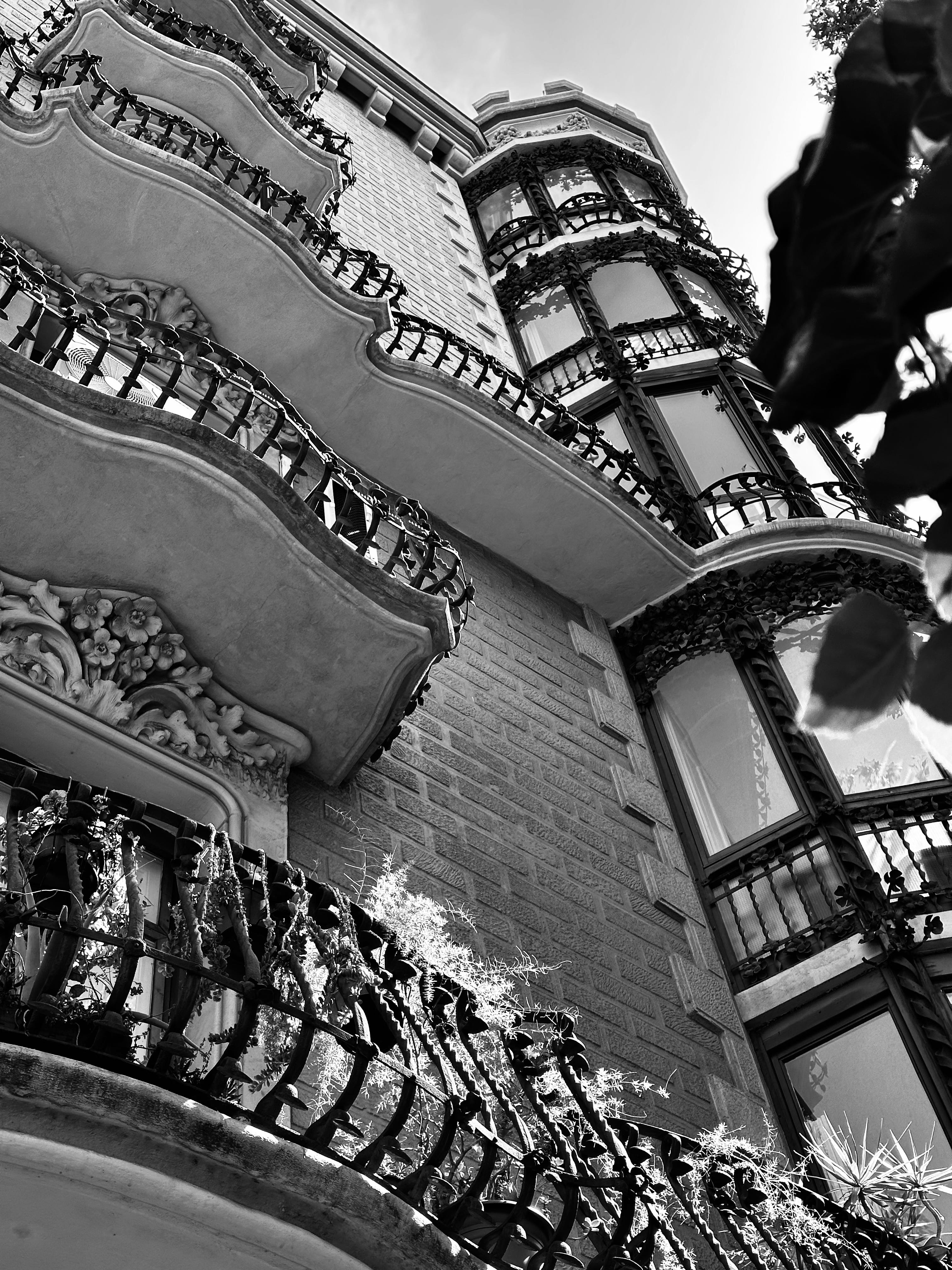 Barcelona, a city celebrated for its vibrant culture and artistic flair, often reveals its truest colours even in shades of grey. This striking monochrome photograph captures a captivating low-angle view of a magnificent building facade, highly reminiscent of Antoni Gaudí's organic and fluid archite…