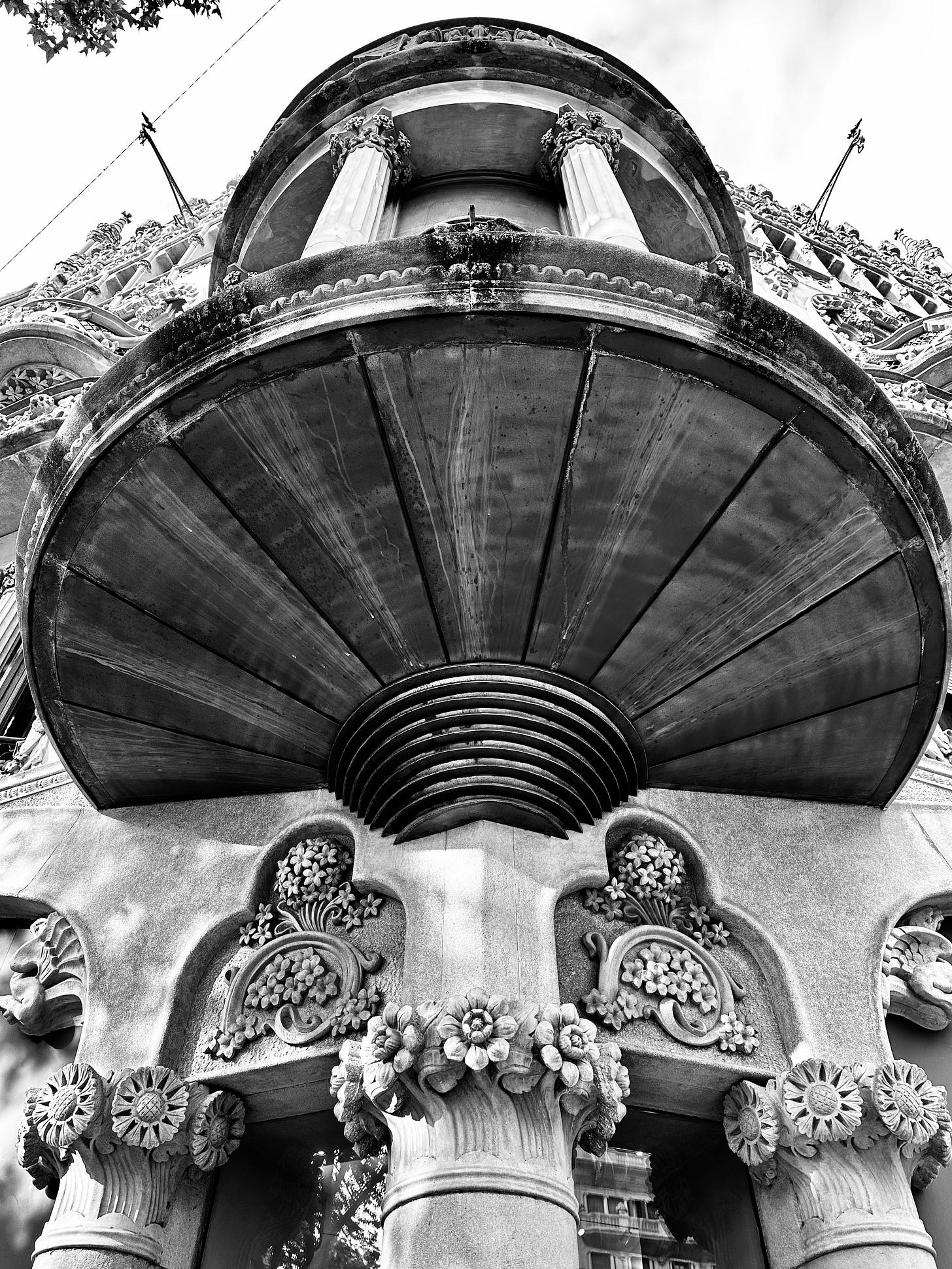 Shot in stark black and white, the image strips away the vibrant Mediterranean palette, forcing the eye to focus on texture and form. What emerges is the extraordinary interplay of Catalan Modernism: the heavy, almost brutalist sweep of the balcony’s underside contrasts sharply with the delicate, jubilant floral carvings blooming below.