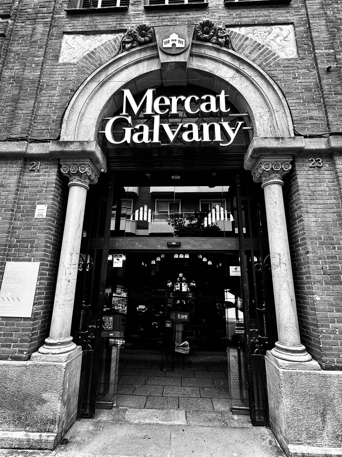 This striking black and white photograph captures the grand main entrance of the Mercat Galvany in Barcelona. The imposing arched doorway, framed by decorative columns, proudly displays the market's name in bold letters, inviting visitors inside. The detailed brickwork of the facade, along with the ornate architectural elements above the arch, speaks to…