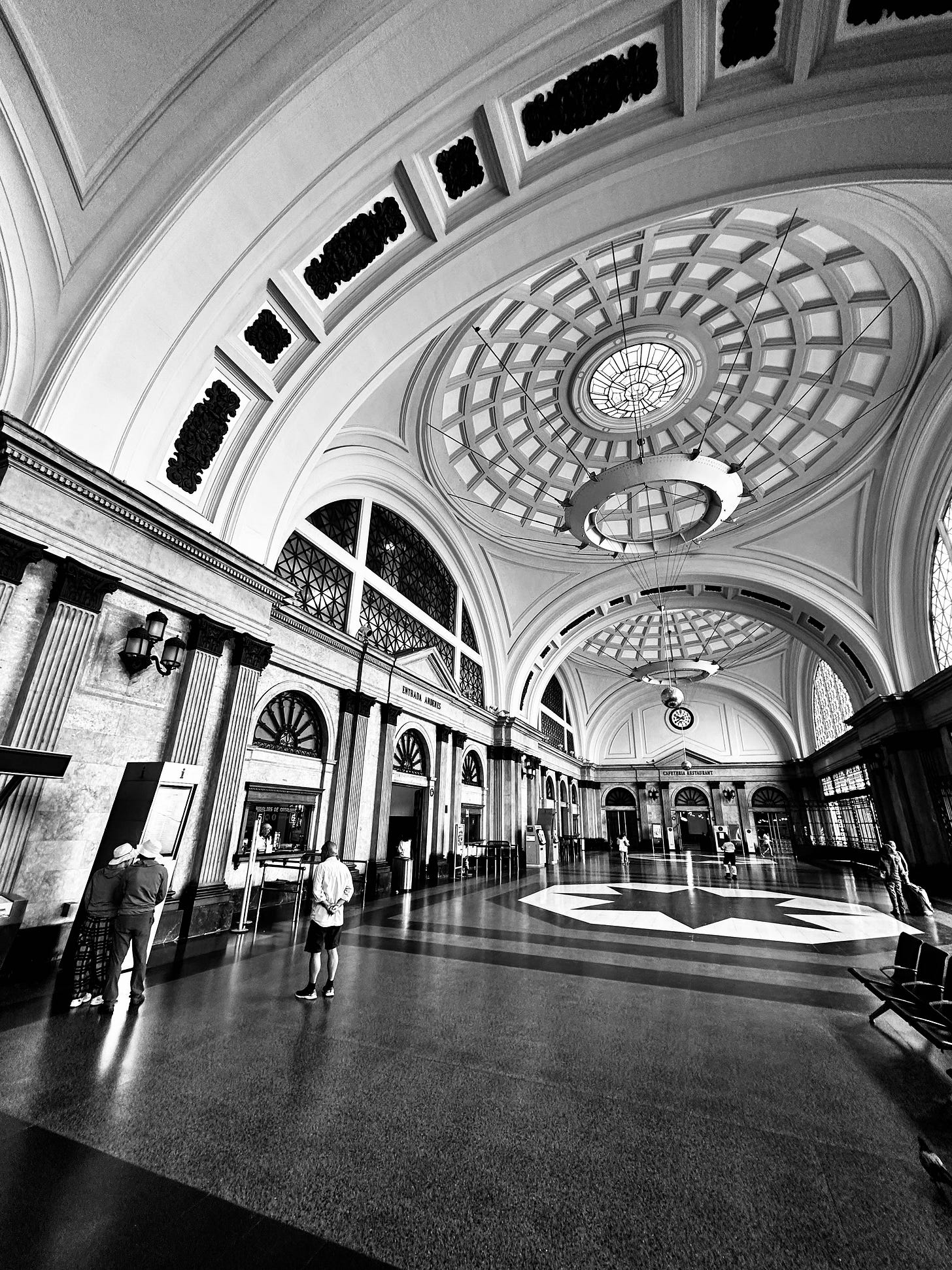 This black-and-white photograph captures the stunning architectural grandeur of Barcelona's Estació de França. The image is taken from a wide angle, looking up and across the main hall. The vast, vaulted ceilings, with their intricate coffered patterns, stretch out and rise towards a central dome and large skylight. From the center of the dome hangs a s…