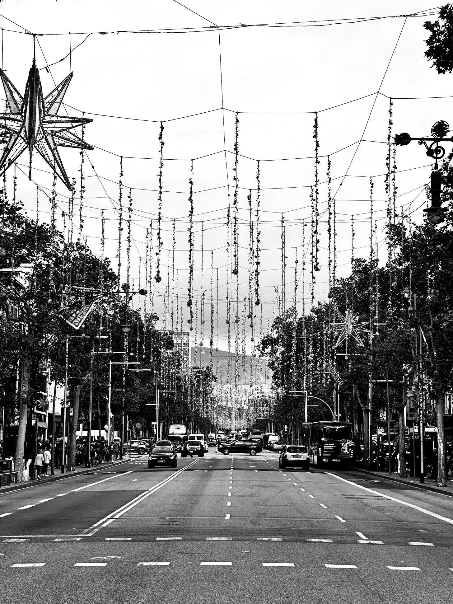 The wide, elegant boulevards of Barcelona take on a dramatic, festive air in this black-and-white streetscape, freshly adorned with seasonal cheer. The eye is immediately drawn upward to a dense canopy of newly hung Christmas lights, which hang like delicate, shimmering rain above the traffic. Large, illuminated stars frame the view, turning the urban thoroughfare into a magical tunnel, signalling the start of the holiday season. Down below, the rush of daily life continues: cars and buses move along the multi-lane road, framed by the dark, textured line of plane trees. The contrast between the hustle of the traffic and the bright, symmetrical wonder of the overhead decoration captures the special, atmospheric blend of everyday life and seasonal grandeur that defines a great city as it prepares for the holidays.
