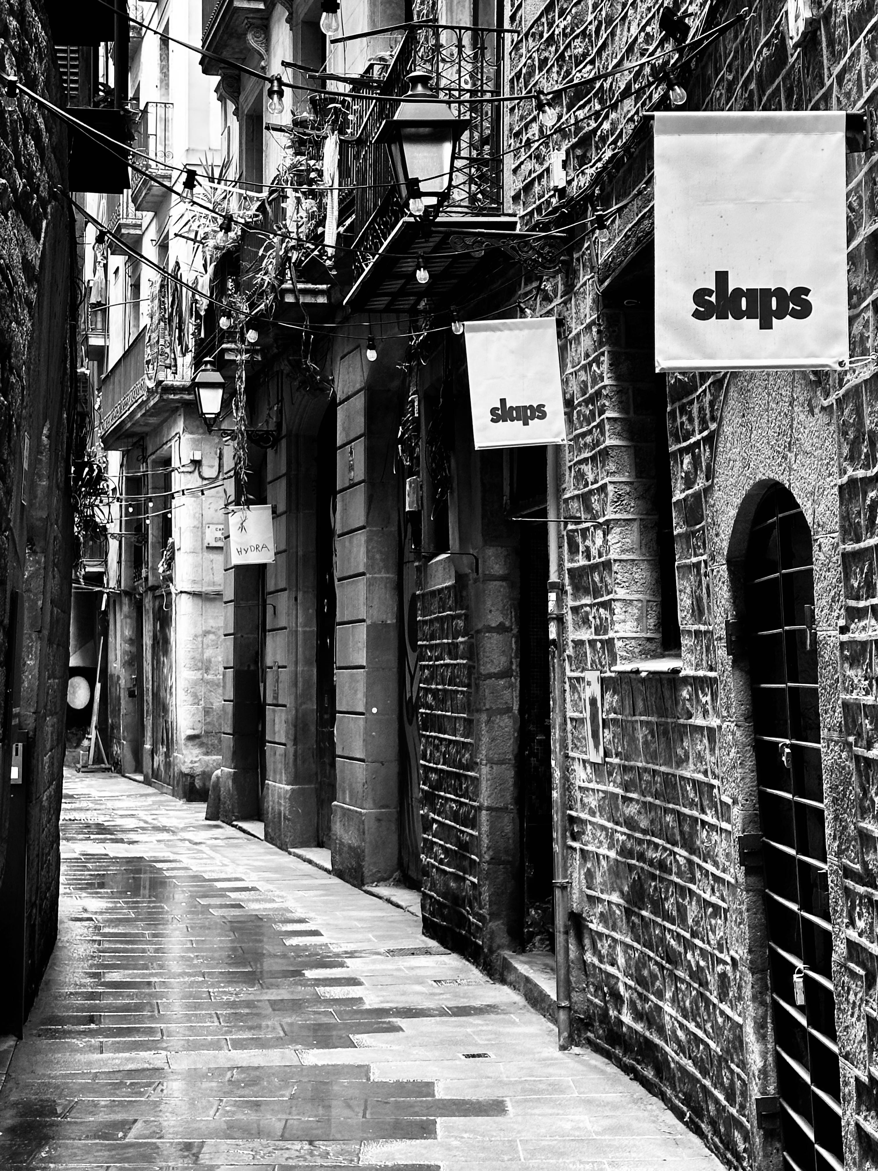 A moody black and white photo of a narrow Barcelona alley, captured after a rain shower. The wet cobblestones reflect the light, leading the eye down the winding street lined with historic buildings and modern signs. This image highlights the unique atmosphere of Barcelona's urban environment, making it ideal for travel blogs or street photography enthu…