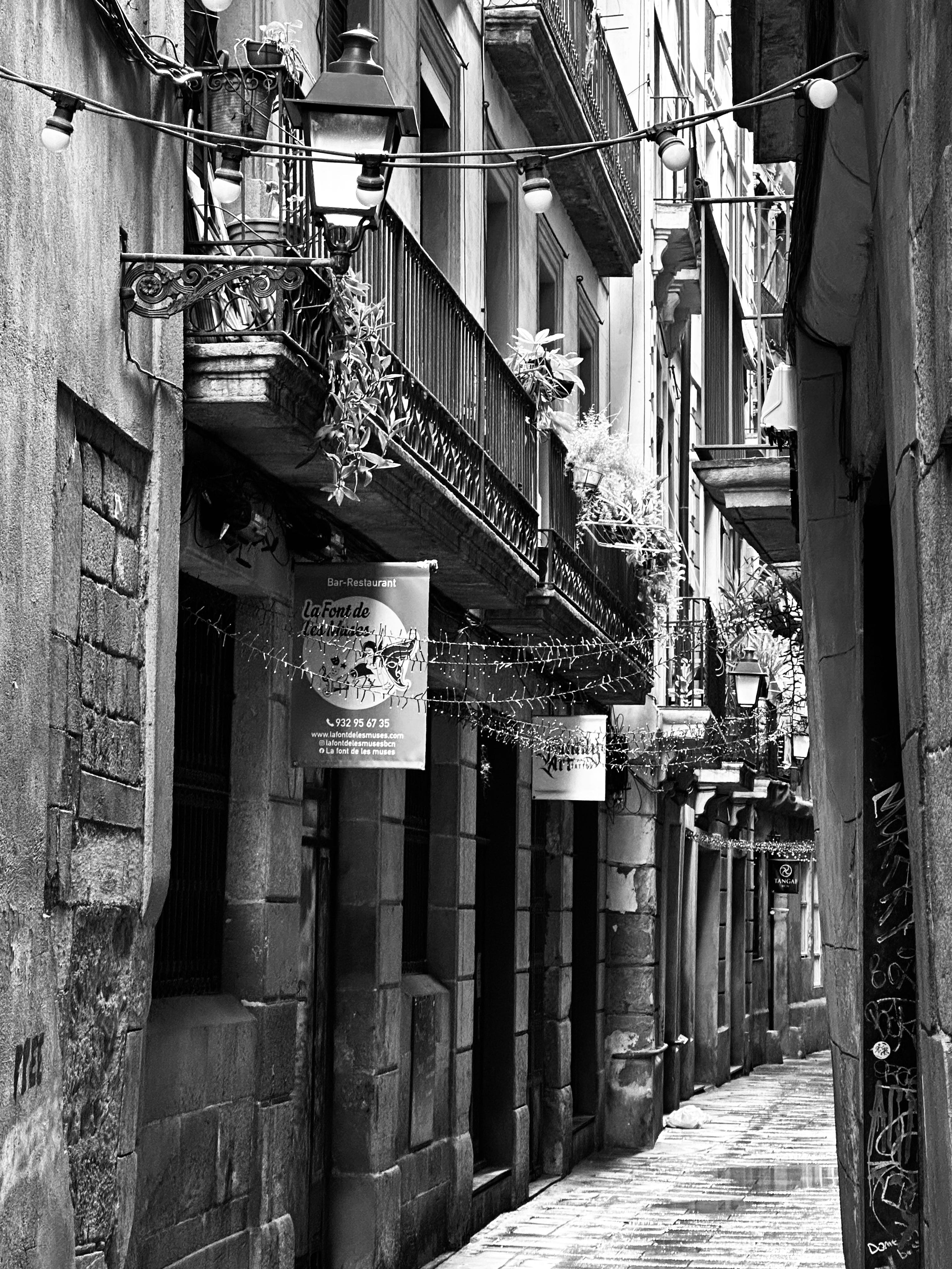 This captivating black and white photograph draws you into the heart of a quiet Barcelona alleyway. The image highlights the long, narrow perspective of the street, lined with historic facades, hanging lanterns, and modern string lights. The wet pavement from a recent rain reflects the city's atmosphere, creating a moody and intriguing urban scene.