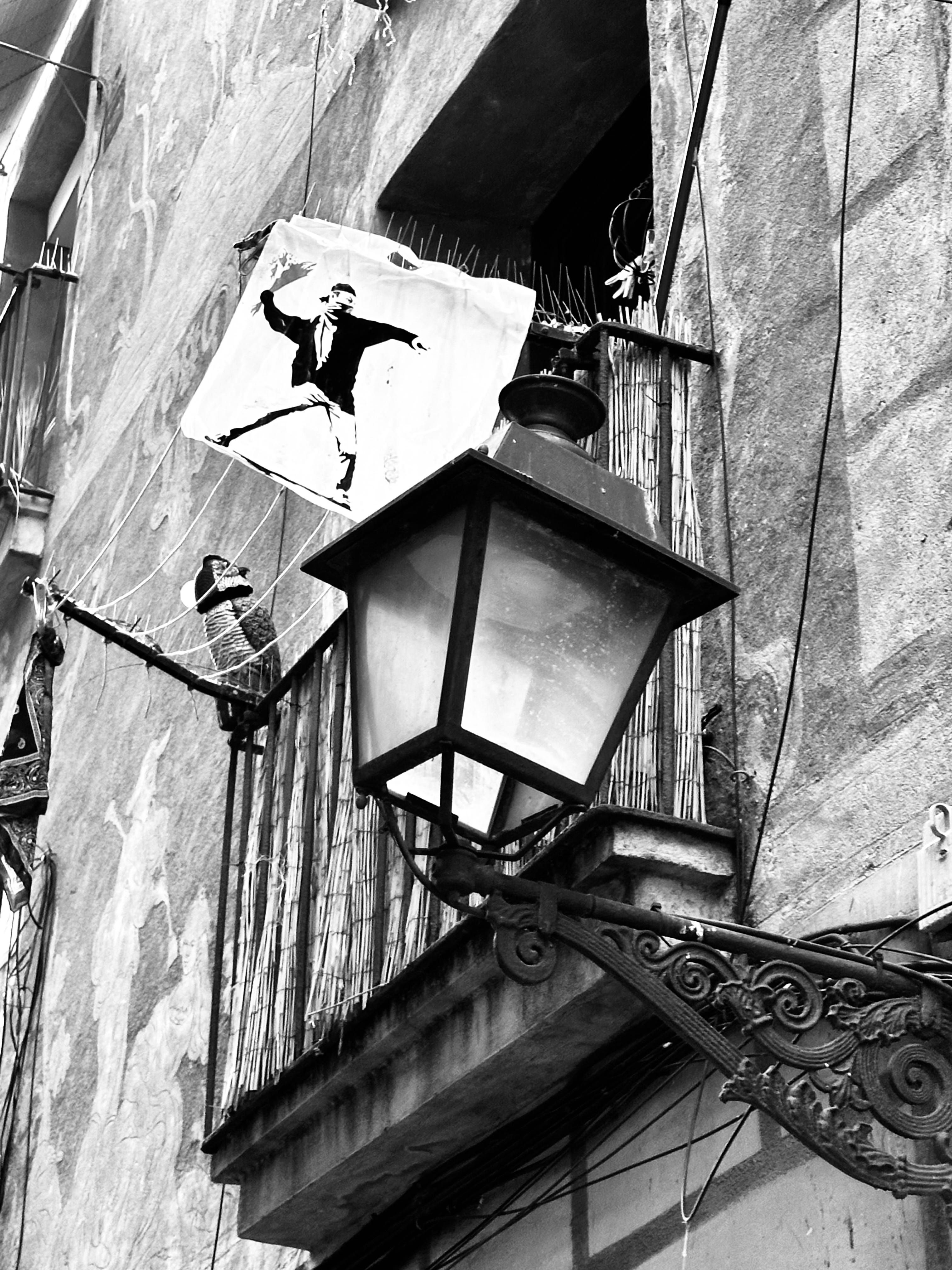 Barcelona, a city celebrated for its vibrant culture and artistic flair, often reveals its truest colours even in shades of grey. This striking monochrome photograph captures a distinctive image displayed on a flag or banner hanging from a balcony.