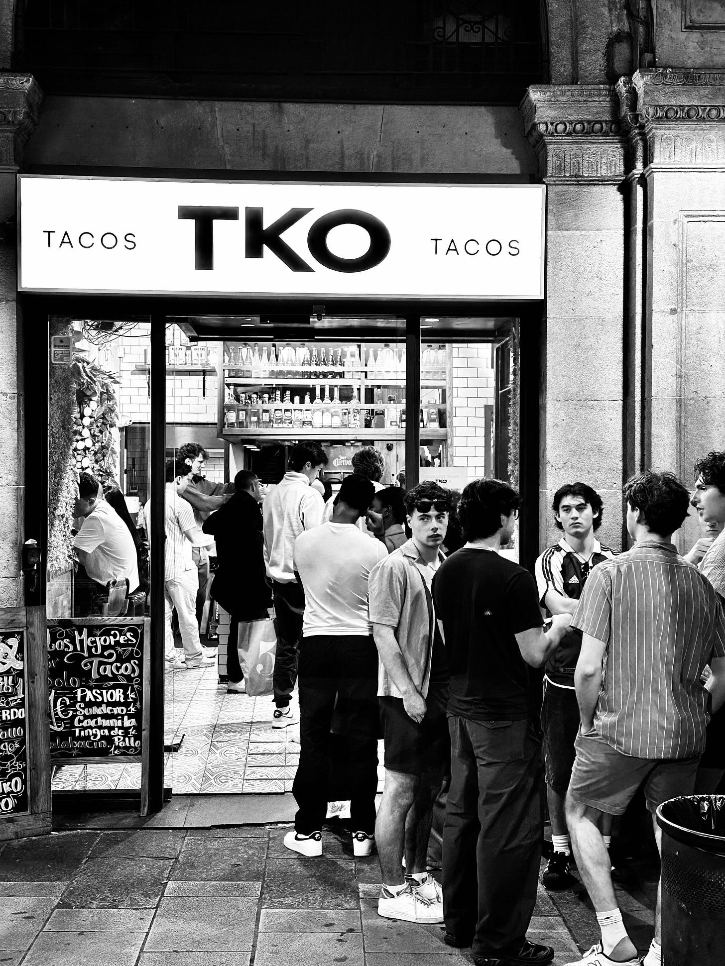 Barcelona’s culinary landscape is famously diverse, extending far beyond tapas and paella into a vibrant, global street food scene. This photograph captures that modern, youthful energy outside TKO Tacos, a popular late-night spot that draws a crowd with its promise of quick, satisfying flavour.