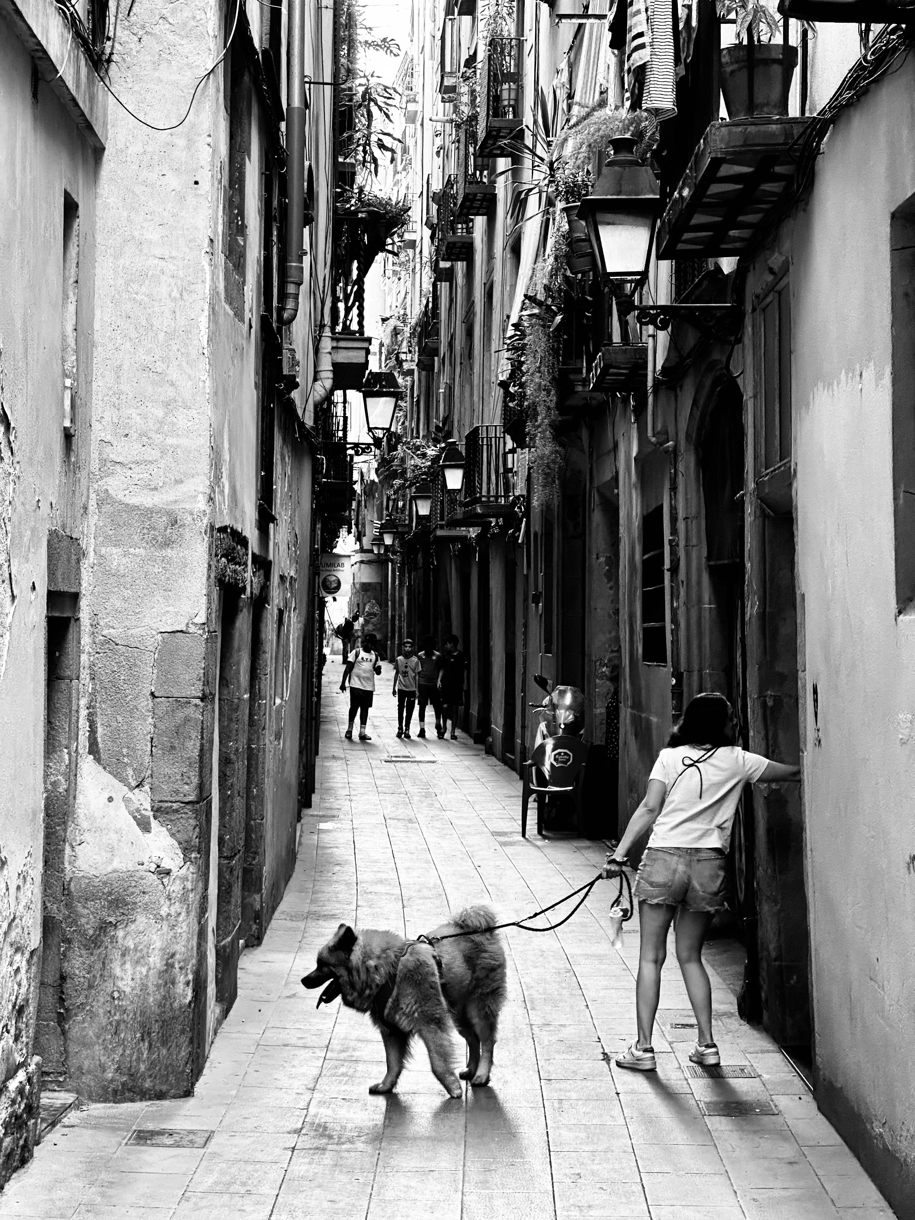 Barcelona, a city celebrated for its vibrant culture and artistic flair, often reveals its truest colours even in shades of grey. This dynamic monochrome photograph captures a bustling alleyway within Barcelona's historic Gothic Quarter, brimming with everyday life and architectural charm.