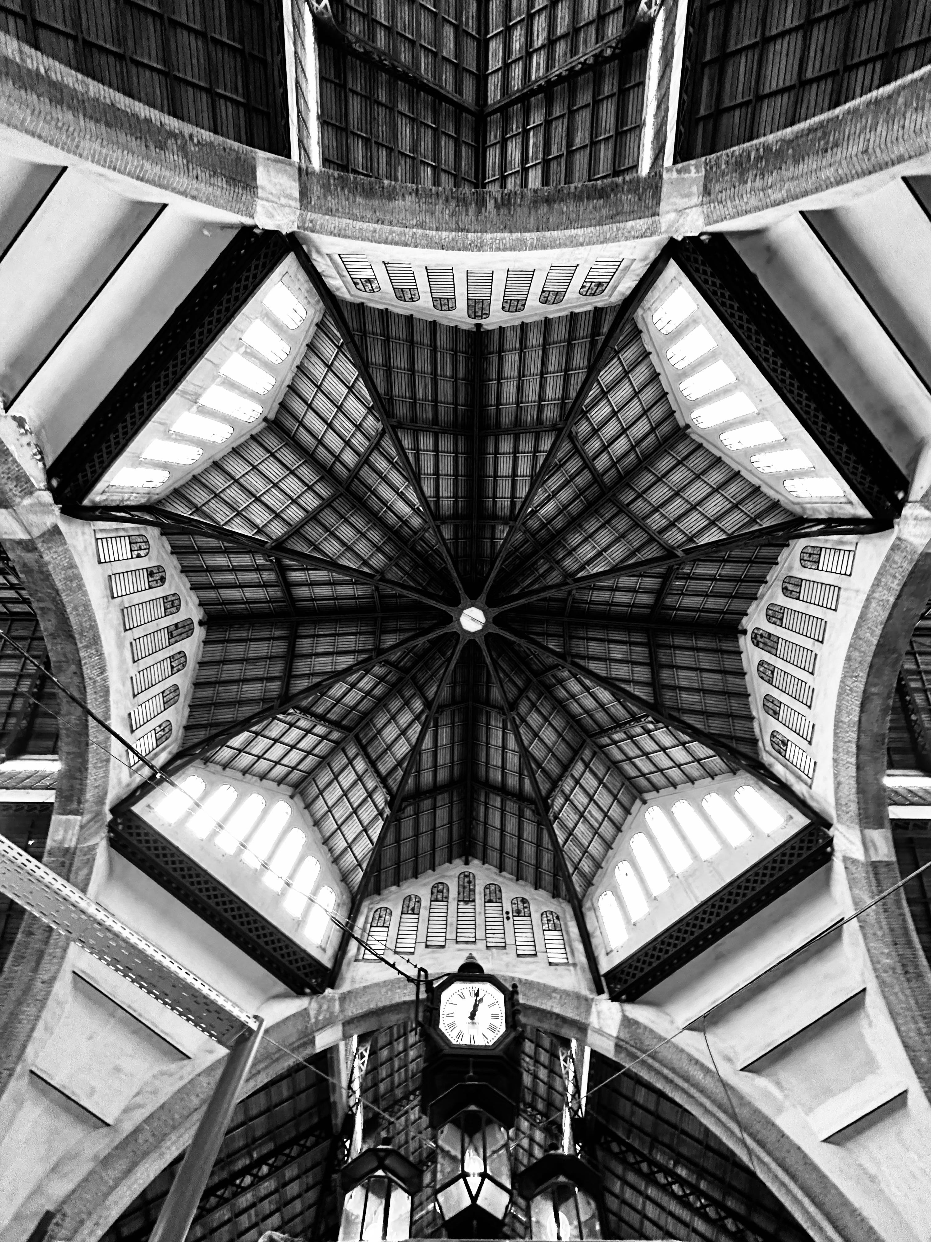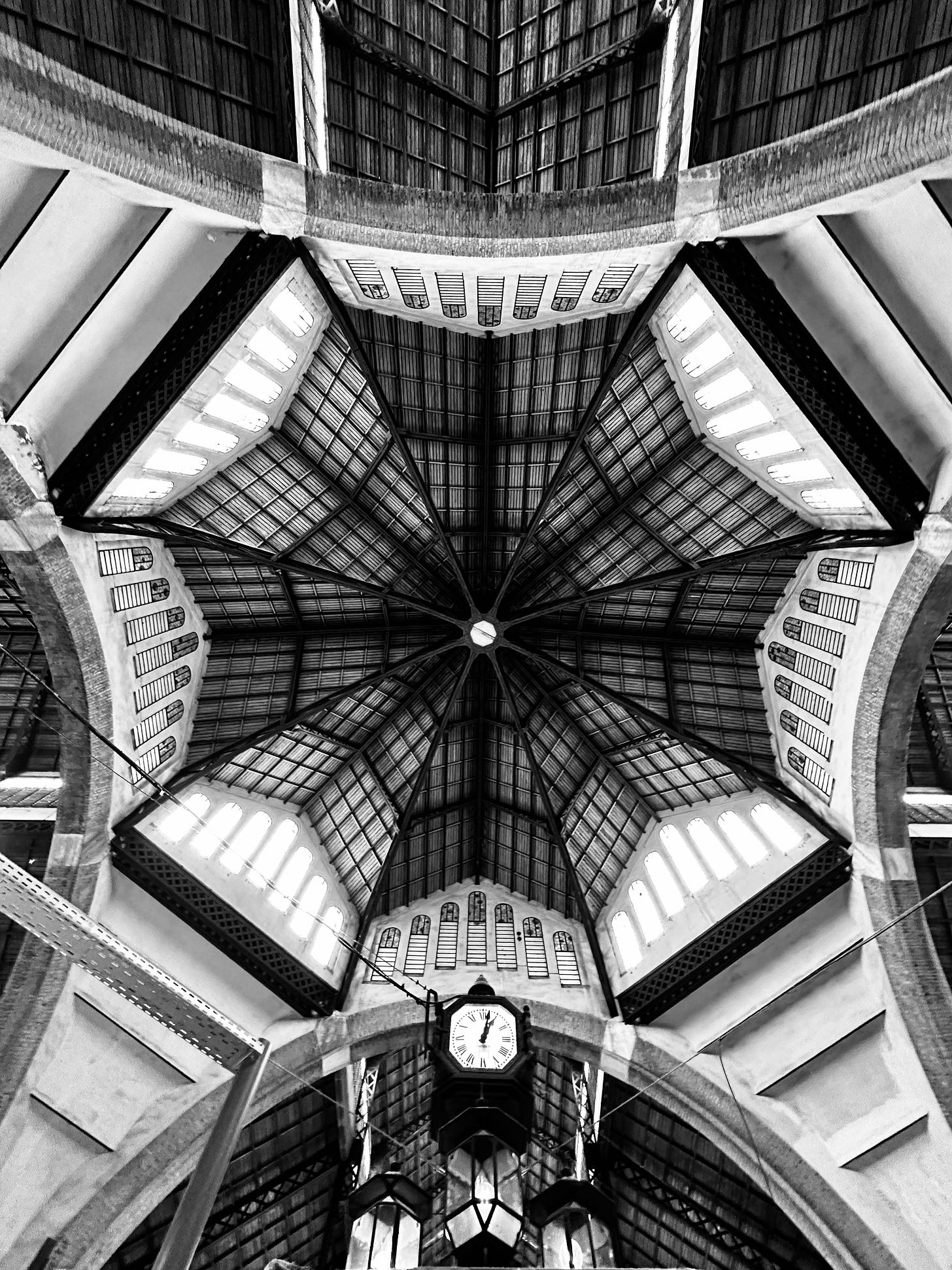 This mesmerising black and white photograph captures the magnificent ceiling of the Mercat Galvany in Barcelona, a true architectural marvel. The shot looks directly upwards, revealing the intricate geometric patterns of the roof structure and the interplay of light and shadow through its skylights or upper windows. The central clock face adds a classic…