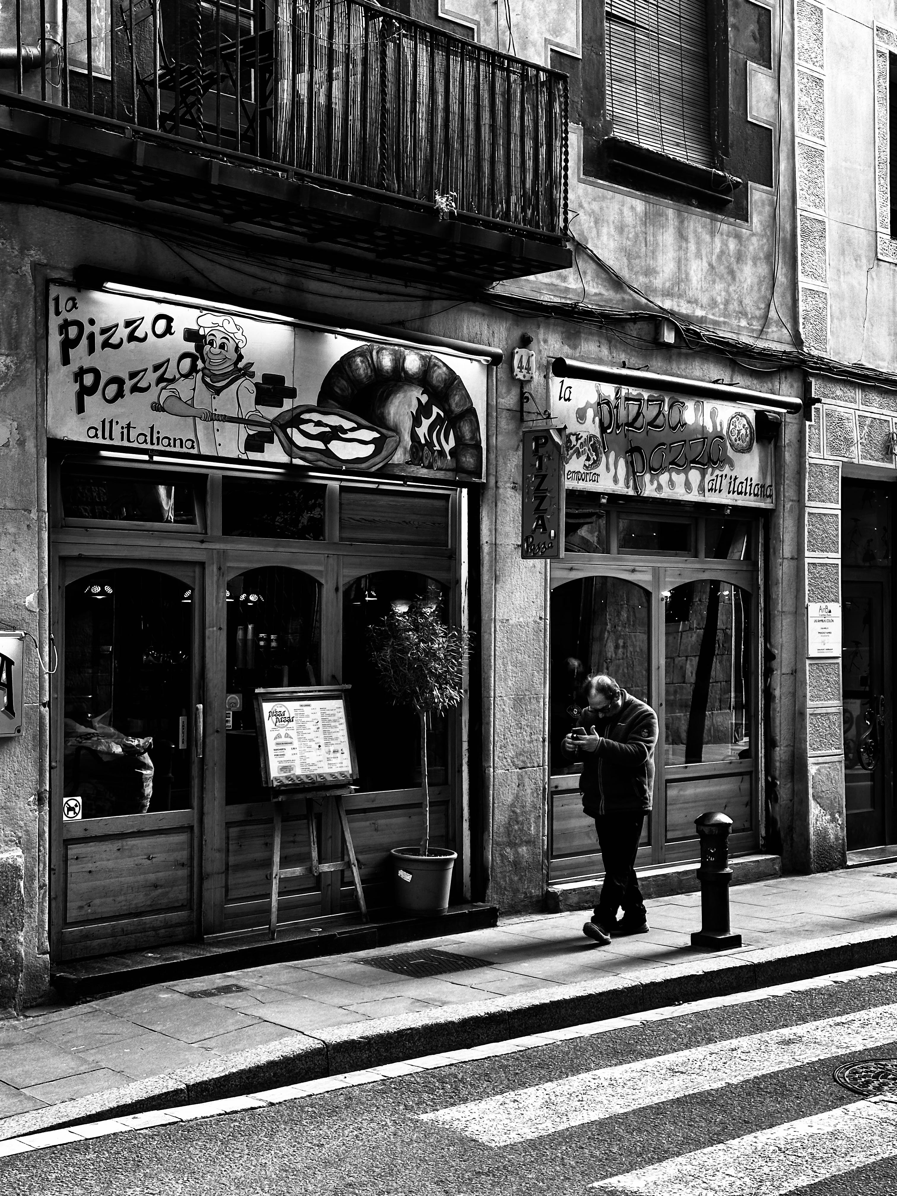 Capture the candid, cinematic charm of Barcelona’s narrow lanes with this black and white fine art print. This photograph features the iconic storefront of “La Pizza Pazza all’italiana“ in the vibrant El Born district, showcasing a unique blend of folk-art murals and modern street life.