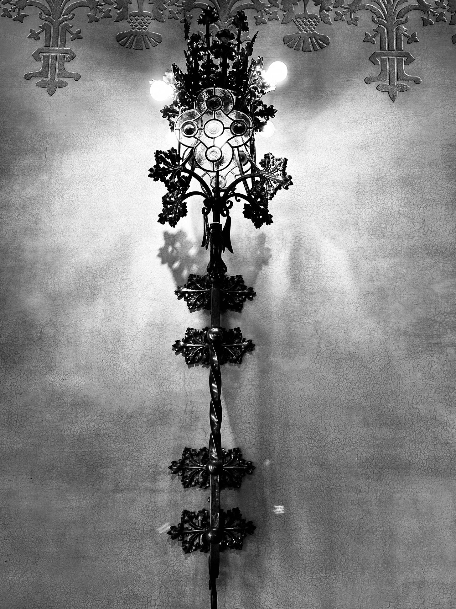 This dramatic black-and-white photograph captures an intricate moment within Casa Amatller, the iconic Modernista masterpiece by architect Josep Puig i Cadafalch. Dominating the frame is an exquisitely detailed, wrought-iron light fixture. Its twisted metalwork, stylised leaves, and intense verticality are hallmarks of Catalan Modernism, projecting a st…