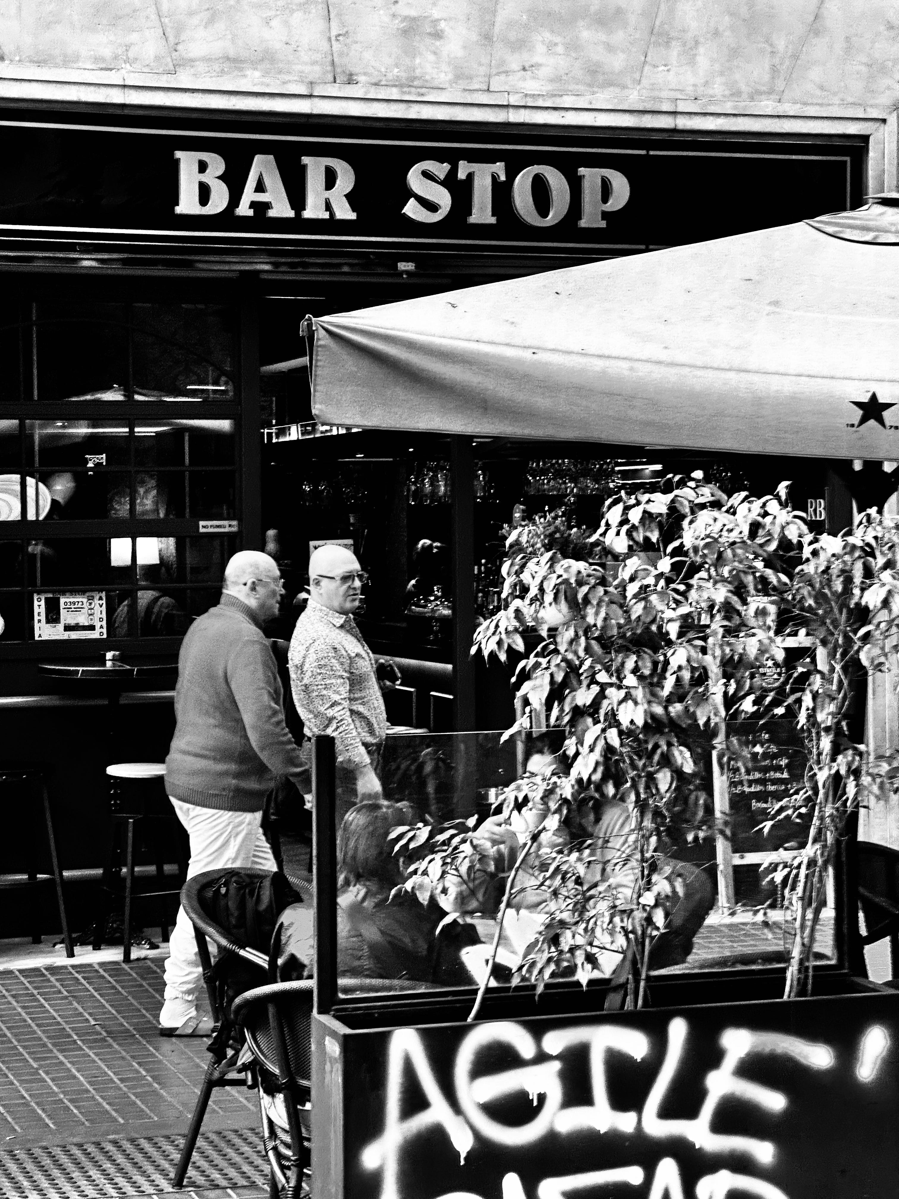 This is a monochrome street photograph capturing a moment of everyday life outside a café or bar. The image has a raw, documentary feel due to the black and white conversion and the natural setting.