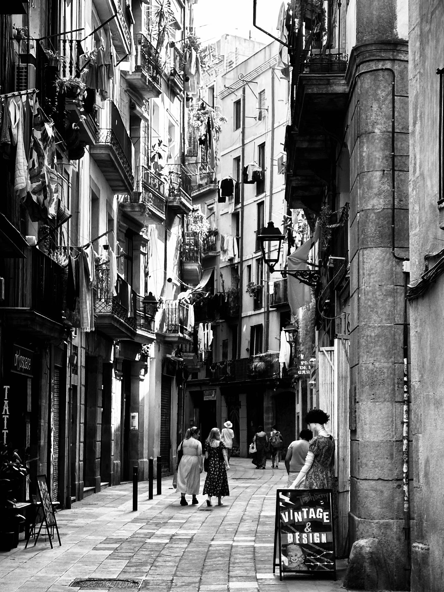 Barcelona, a city celebrated for its vibrant culture and artistic flair, often reveals its truest colours even in shades of grey. This evocative monochrome photograph captures a quintessential narrow street in Barcelona, likely within its historic quarters, characterized by towering buildings and overhead lines of drying laundry.