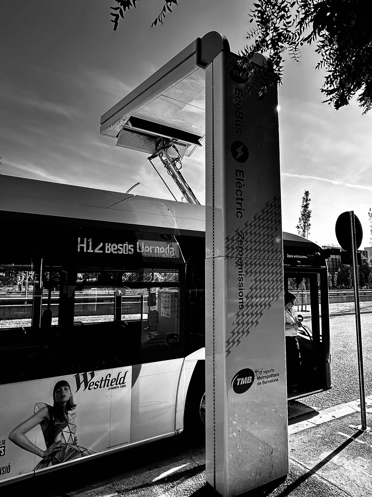 The electric bus, with its route designation “H12 Besòs Verneda,” sits ready. The high-contrast black and white processing highlights the sleek curves of the bus and the sophisticated mechanical arm connecting it to the charger. This mechanism, designed for rapid overhead connection, minimises downtime and maximises efficiency on busy urban routes.
