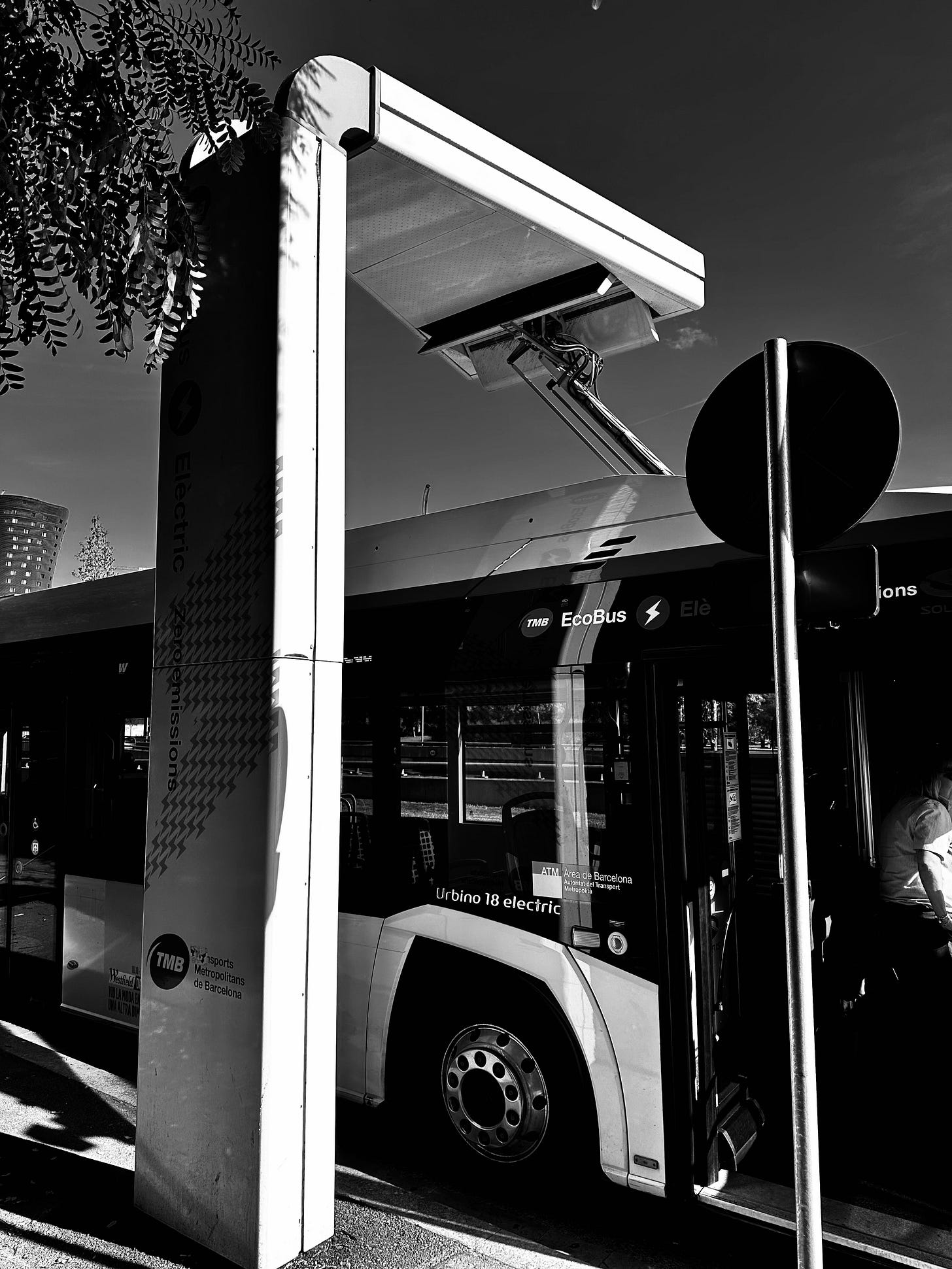 While Barcelona is famous for celebrating its past, it is equally dedicated to building a sustainable future. This photograph captures a distinct piece of that modern vision: an electric bus charging station integrated into the urban landscape.
