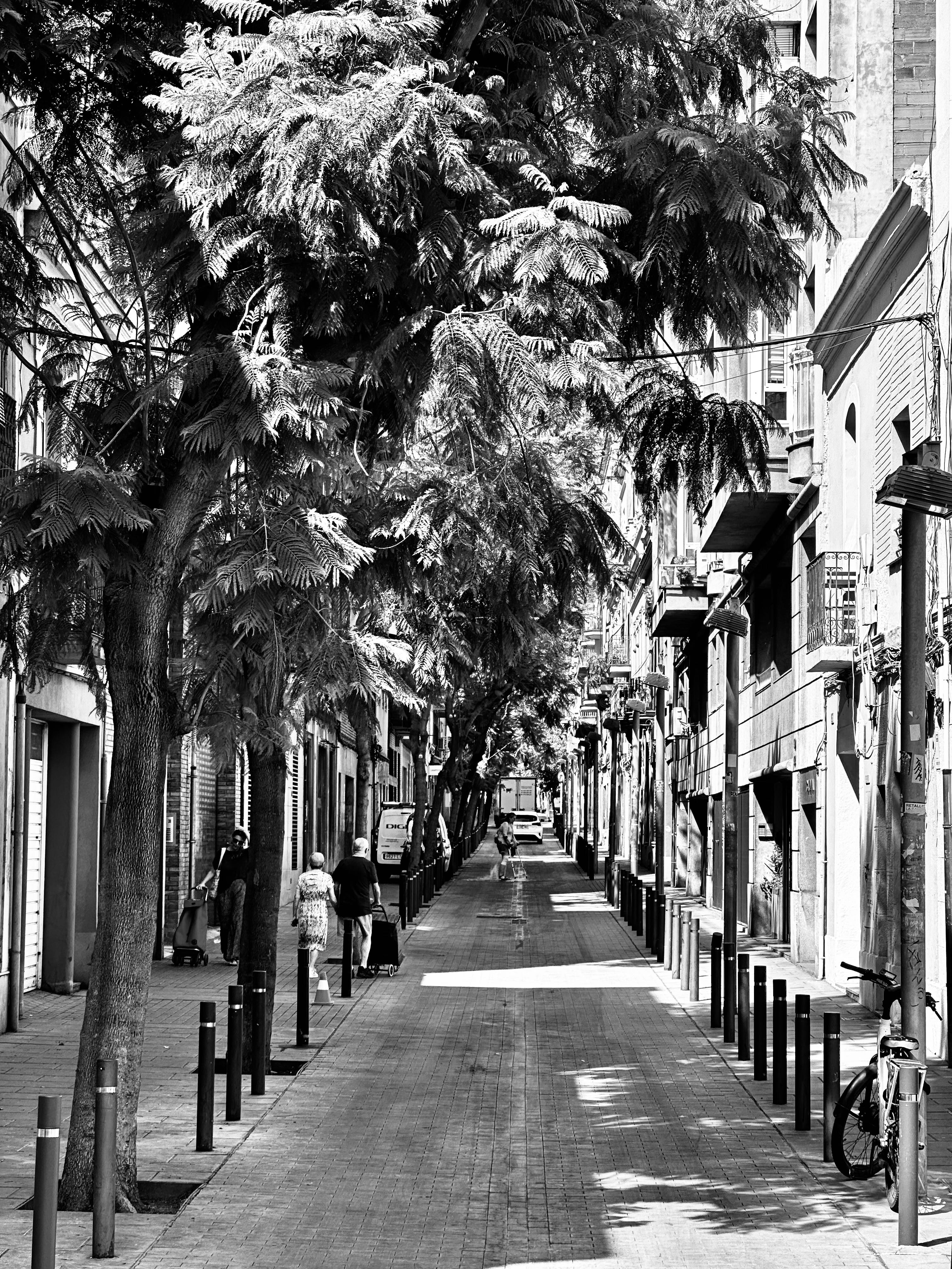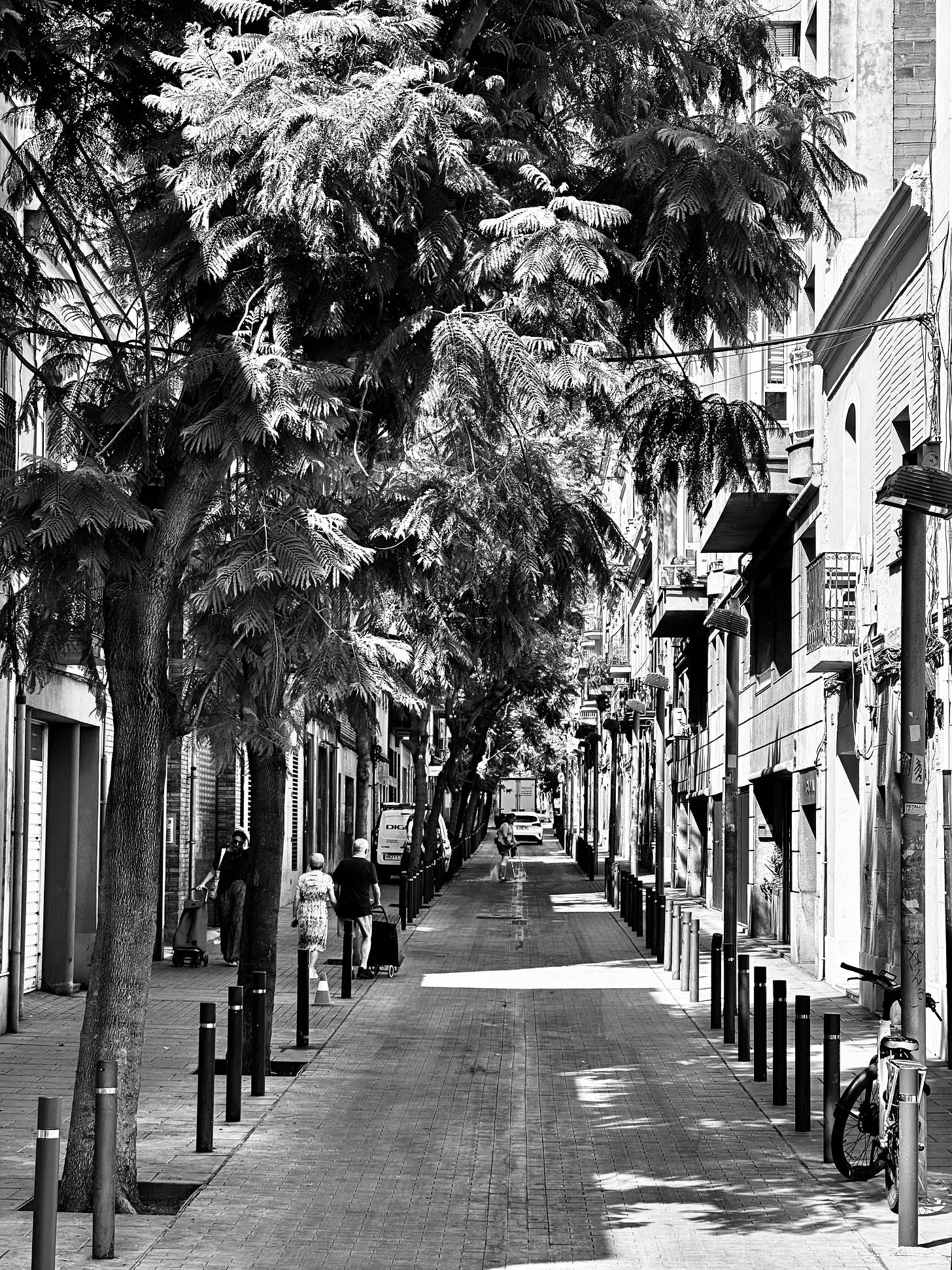 This inviting black and white photograph captures the quiet charm of a tree-lined street, reminiscent of Barcelona's tranquil Sant Andreu neighbourhood. The perspective draws you down a pedestrianised lane, shaded by mature trees whose foliage creates a beautiful dance of light and shadow on the pavement. Traditional buildings with their characteristic …