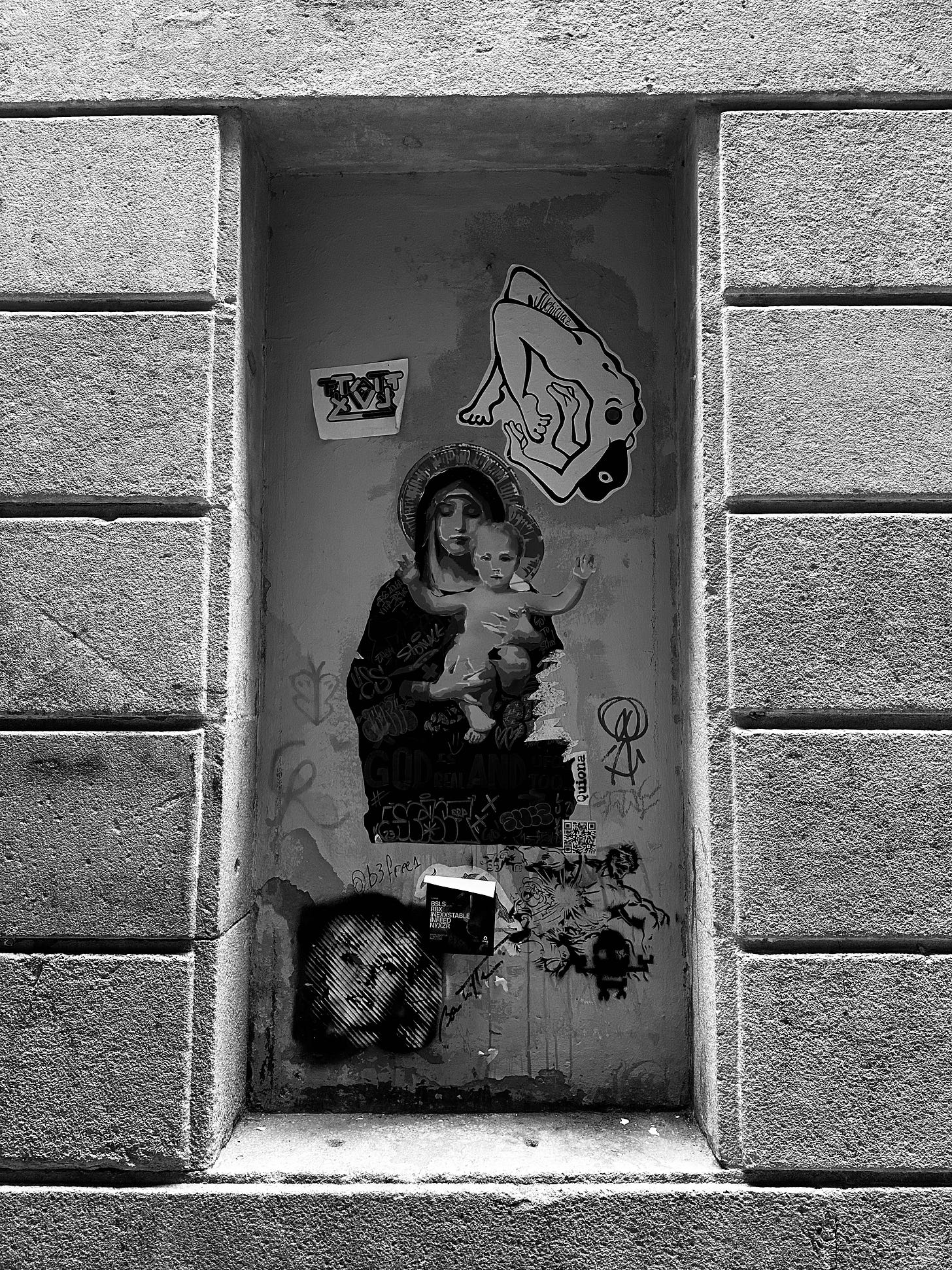A striking black-and-white image from a quiet corner of Barcelona's Barri Gòtic. This photo captures a small, recessed niche in an ancient stone wall that has become an unexpected canvas for street art. At its centre, a religious icon of the Madonna and Child coexists with modern graffiti and stylised stickers, creating a powerful juxtaposition of the s…