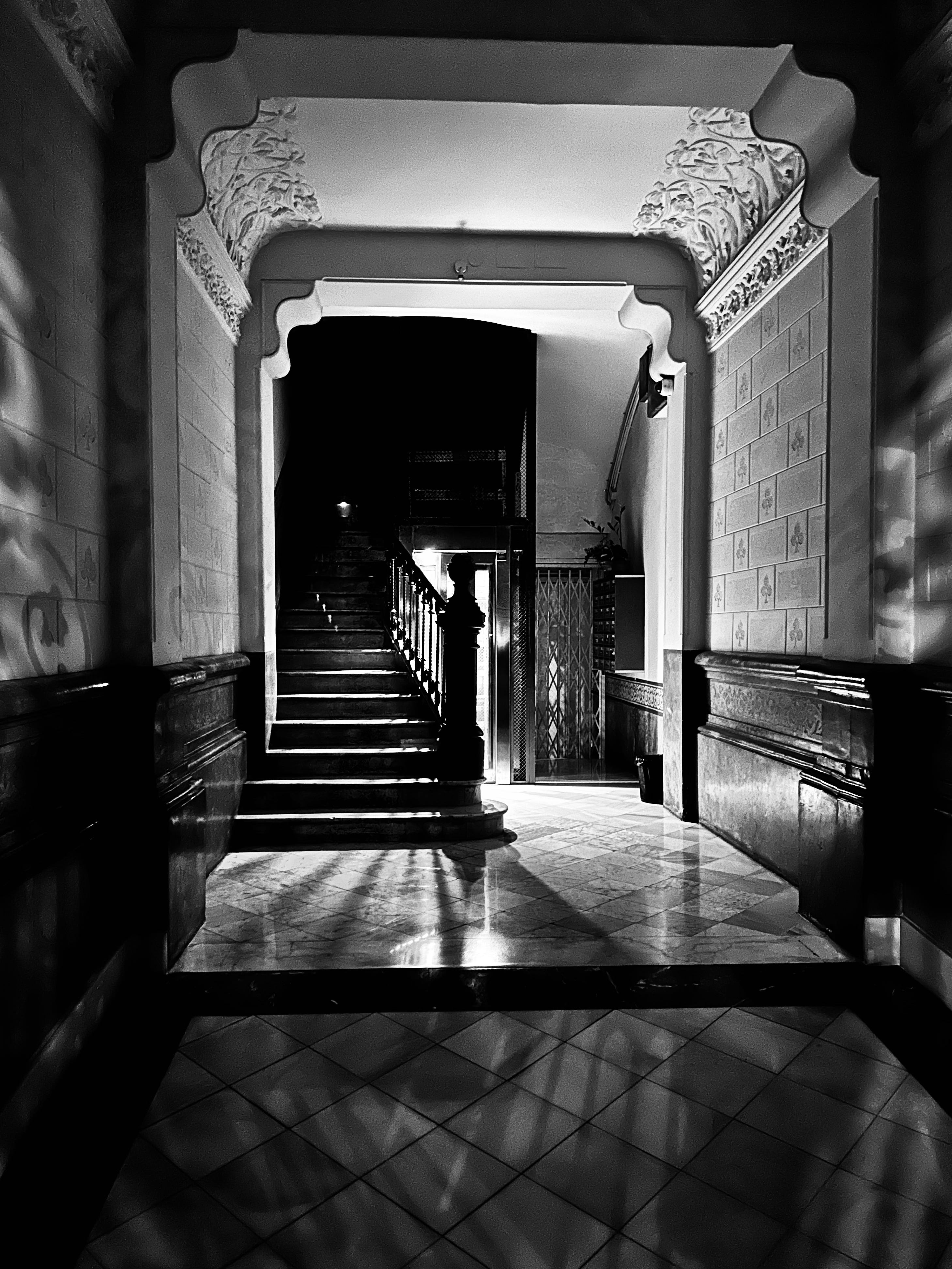 Beyond the sleek lines of contemporary design, Barcelona hides a world of intricate, breathtaking beauty, often found in its most private spaces. This photograph captures a moment of intense drama within the entryway of a historic building, focusing on the unique flair of Catalan Modernism. Observe the exquisite details: the scalloped arch, the elaborate floral plasterwork, and the long, theatrical shadows cast across the marble floor. The juxtaposition of the dark, handsome wooden staircase and the delicate light illuminating the walls tells a story of craftsmanship and legacy. This image is a tribute to the architects who transformed ordinary entryways into works of art. Join BarcelonaJournal.com in celebrating the hidden beauty and dramatic flair of the city’s architectural soul.