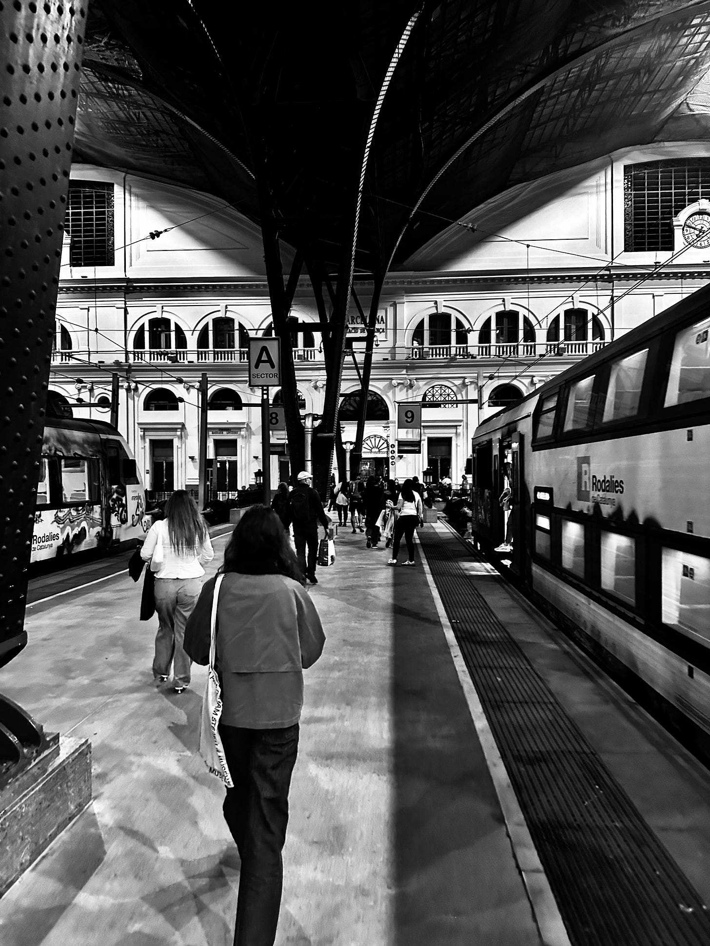 The black and white processing heightens the drama between the brilliant interior lights and the heavy shadows cast by the roof structure. This image beautifully captures the unique blend of historic architectural grandeur and the constant, modern rhythm of commuter life within Barcelona’s grandest terminal.