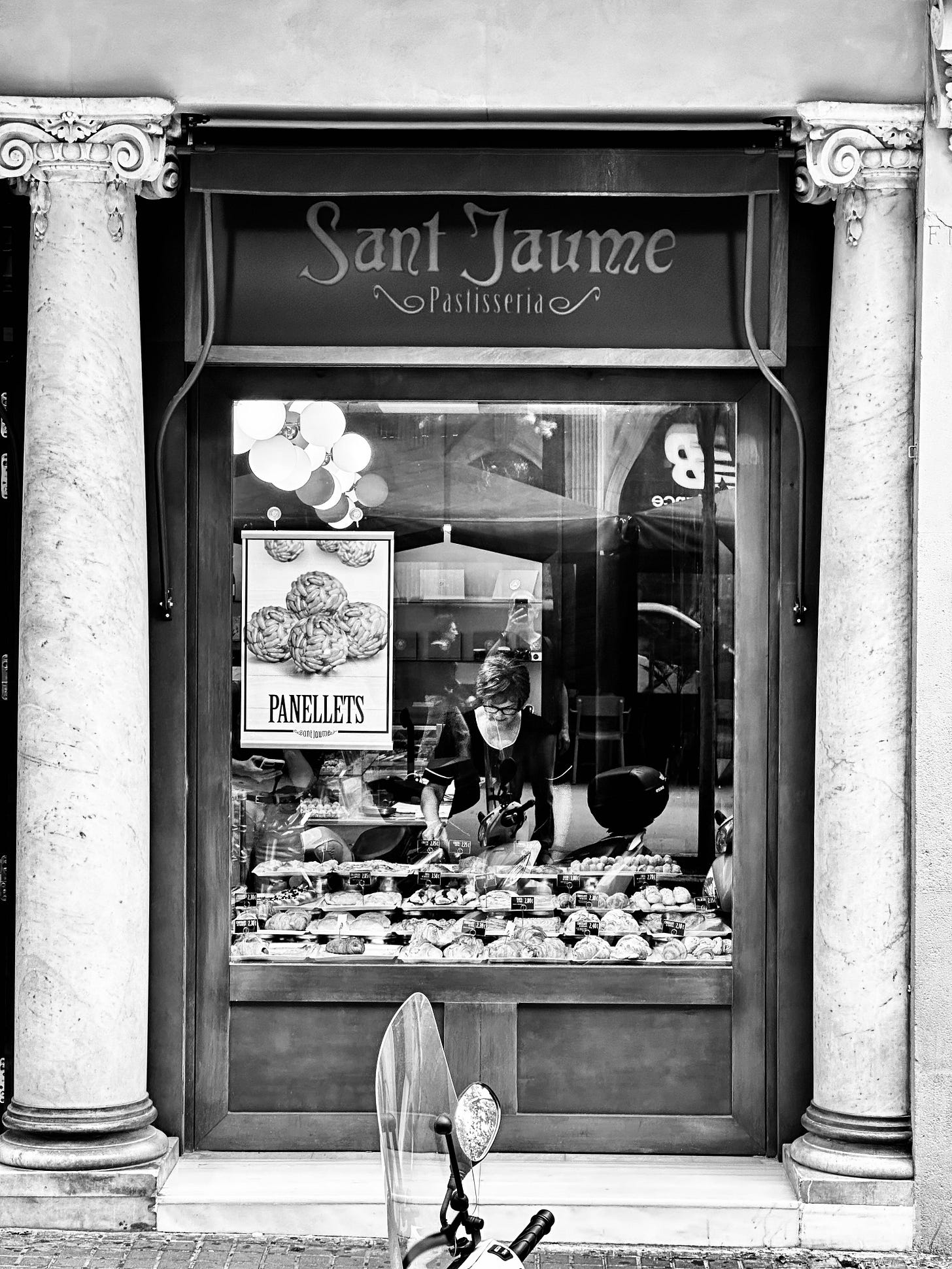 Framed by two magnificent classical columns, the storefront of Sant Jaume Pastisseria offers a delicious glimpse into Barcelona’s culinary soul. The black-and-white photograph captures a busy worker inside, surrounded by tiers of traditional baked goods. Most notably, a prominent sign advertises “PANELLETS”—the special almond paste pastries traditionall…