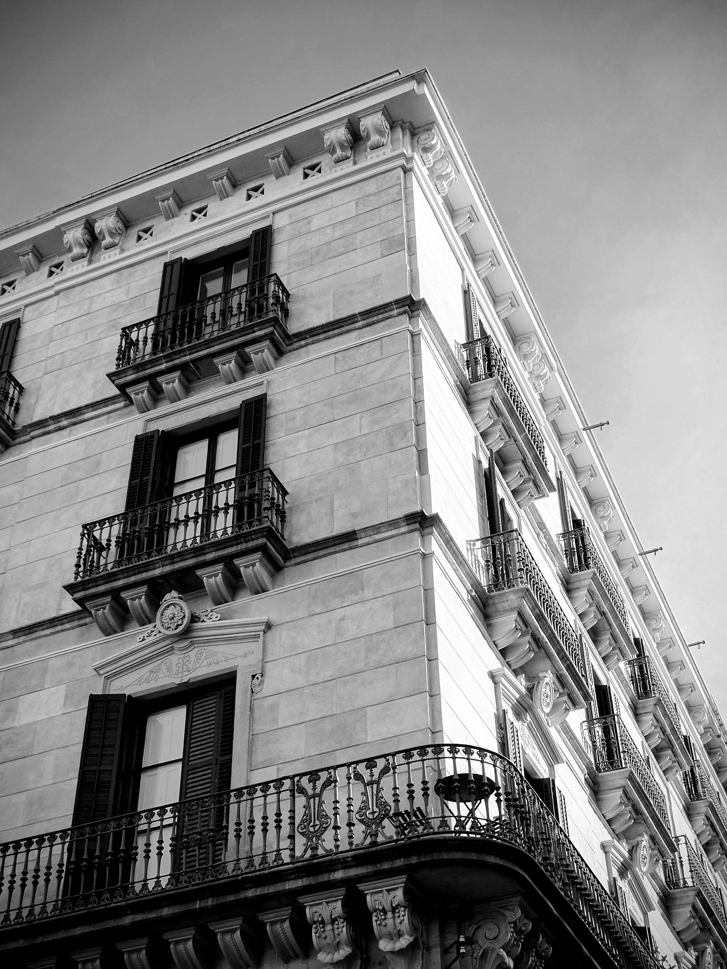 The composition centres on the sharp vertical line of the building corner, flanked by symmetrical rows of elegant wrought iron balconies. Each floor repeats the pattern of shutters and decorative stonework, creating a powerful sense of scale and order. At the very top, a subtle ornate crest crowns the structure against a clear sky.