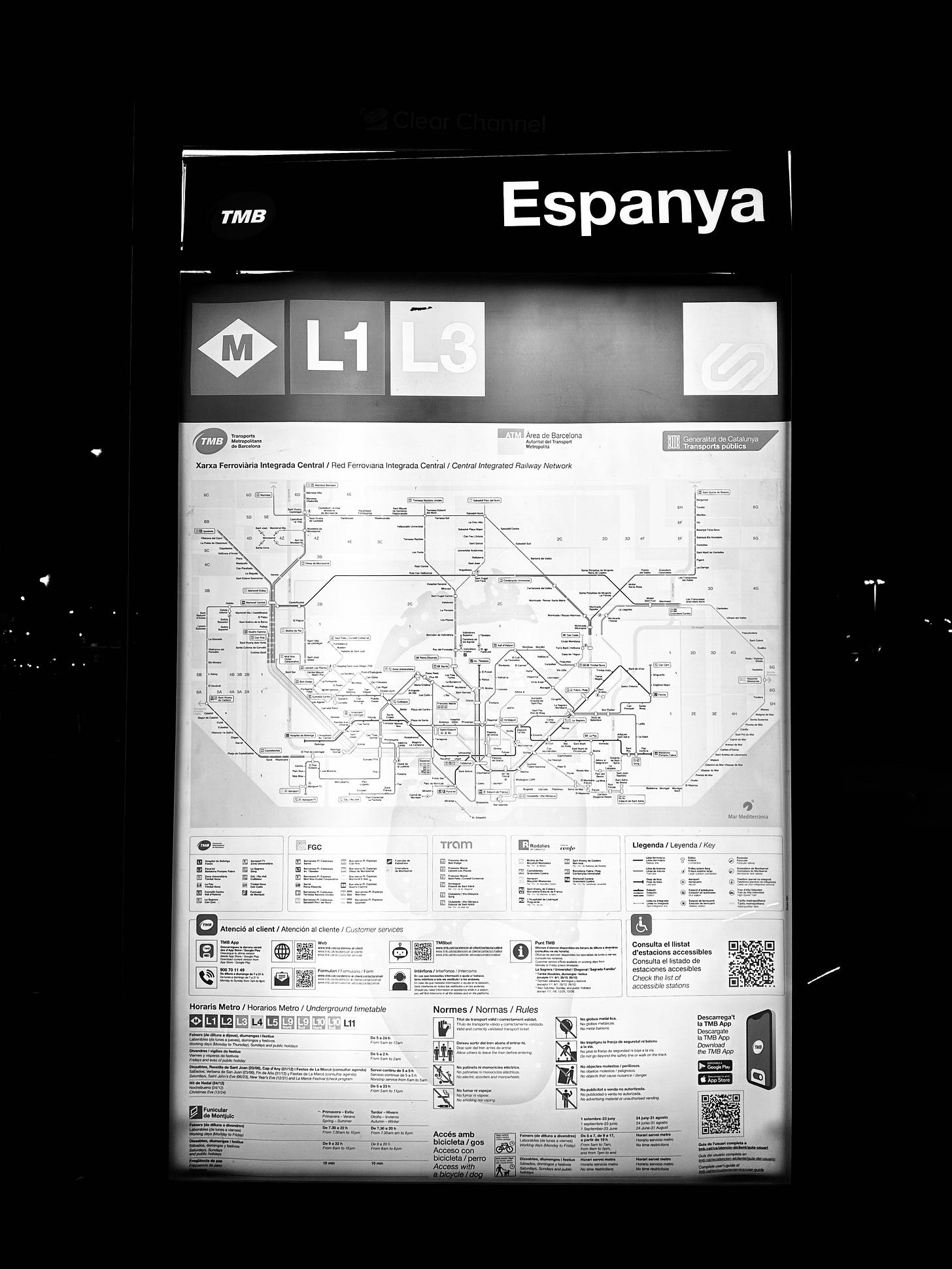 Leaving the quiet elegance of the residential halls behind, this final photograph captures the stark, functional beauty of nocturnal Barcelona. The image focuses on a major transit information sign at Plaça d’Espanya, a brightly illuminated beacon of urban order against the deep black of the night. It highlights the city’s integrated transit network—the Metro, FGC, and Tram—reducing the complex system to an elegant, luminous web of lines. This photo is a powerful tribute to the infrastructure that keeps Barcelona moving, showing the clean, essential design that guides residents and visitors alike through the city after dark. Join BarcelonaJournal.com as we appreciate the utility and structured clarity of the modern urban landscape.