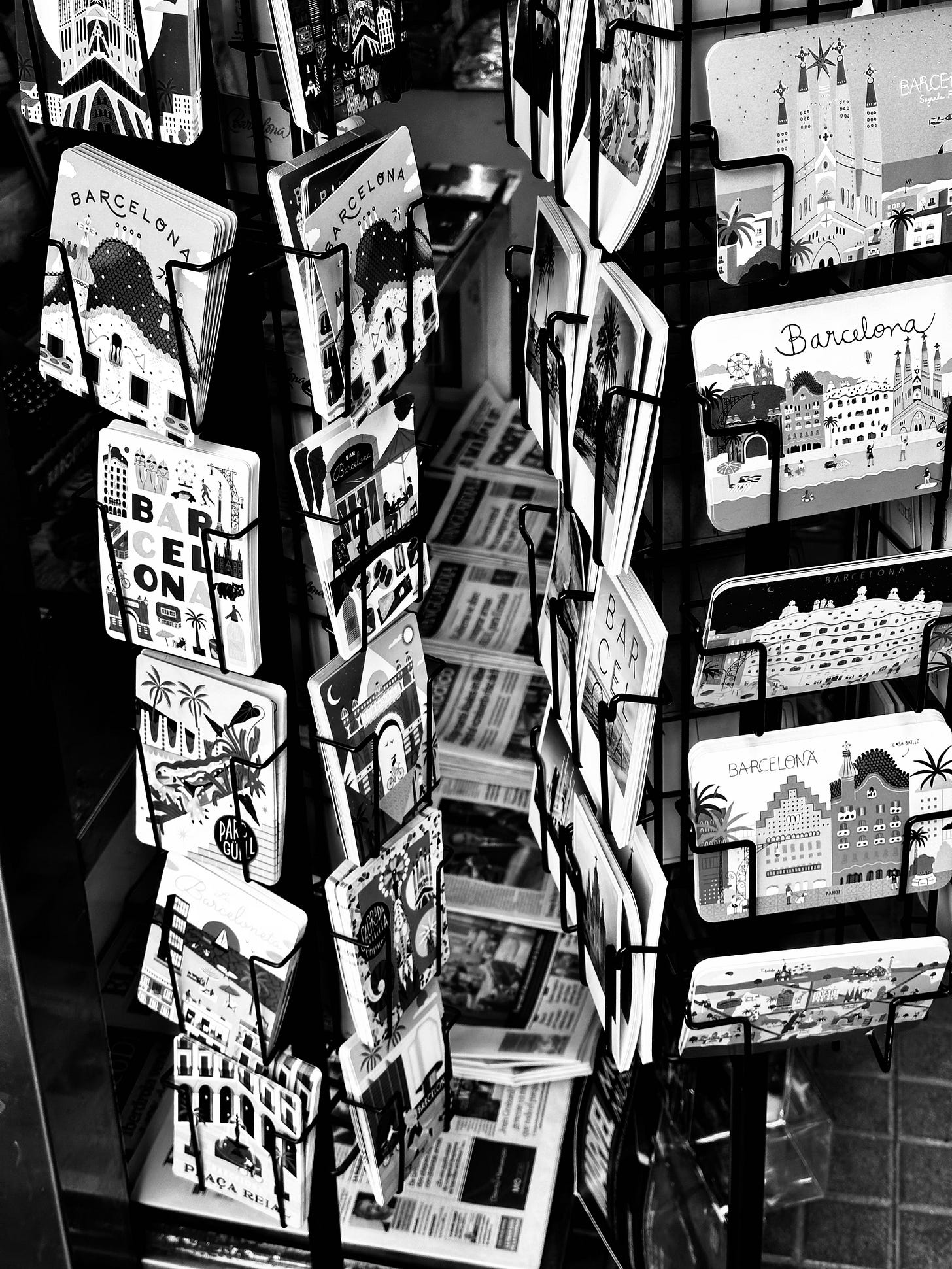 The high-contrast black and white processing transforms the busy souvenir rack into an almost graphic pattern. The focus is sharp on the variety of postcards and magnets, which feature distinct, modern, and stylised representations of Barcelona’s most iconic sights. We can clearly discern the towering spires of the Sagrada Família, the fanciful structures of Park Güell, and the archways of Plaça Reial.