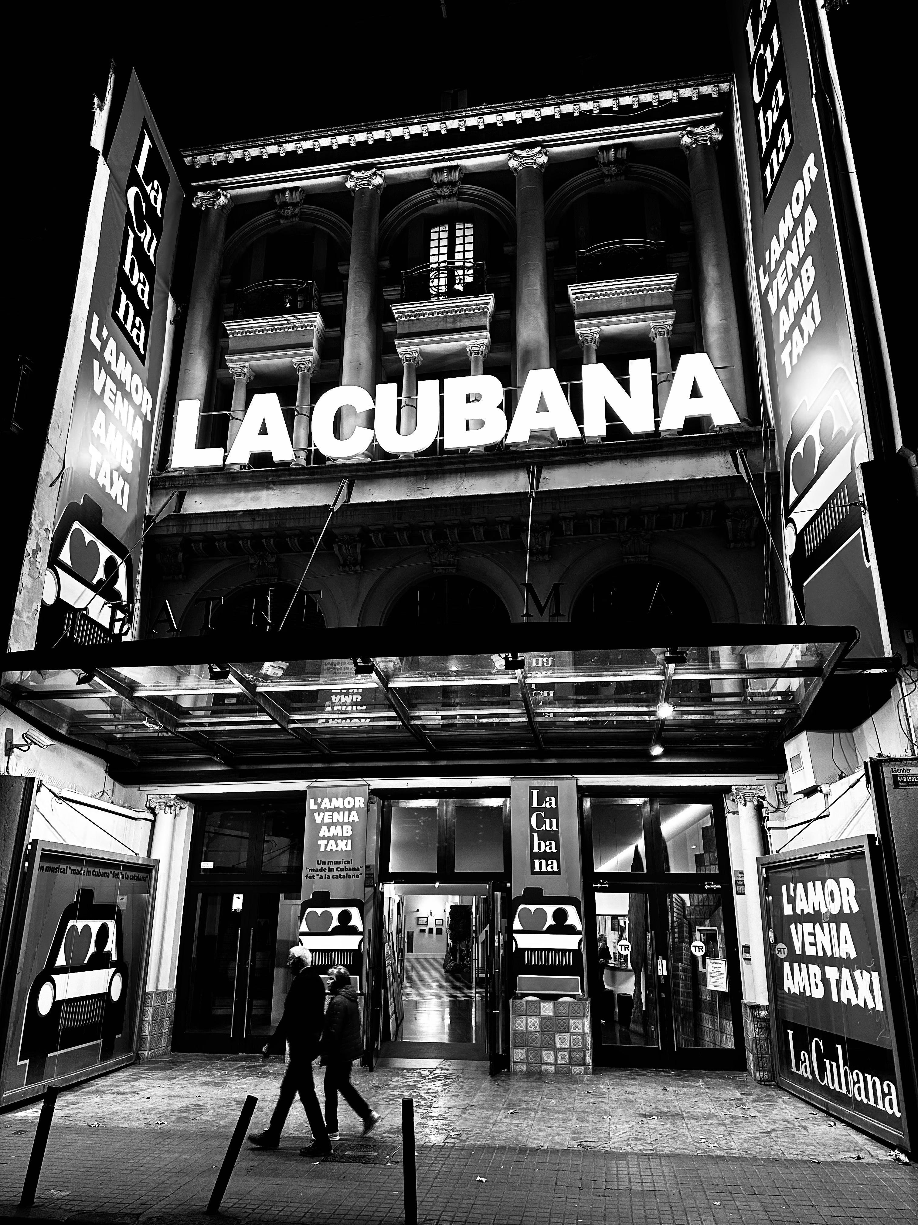 The photograph is a study in verticality and performance. Above, the grand, classical columns and arched windows of the building’s original architecture stand stoically, a testament to its long history. Below, modern energy takes over. The boldly lit sign for “LA CUBANA” cuts across the night sky, its sheer brightness contrasting sharply with the deep shadows of the stone façade.