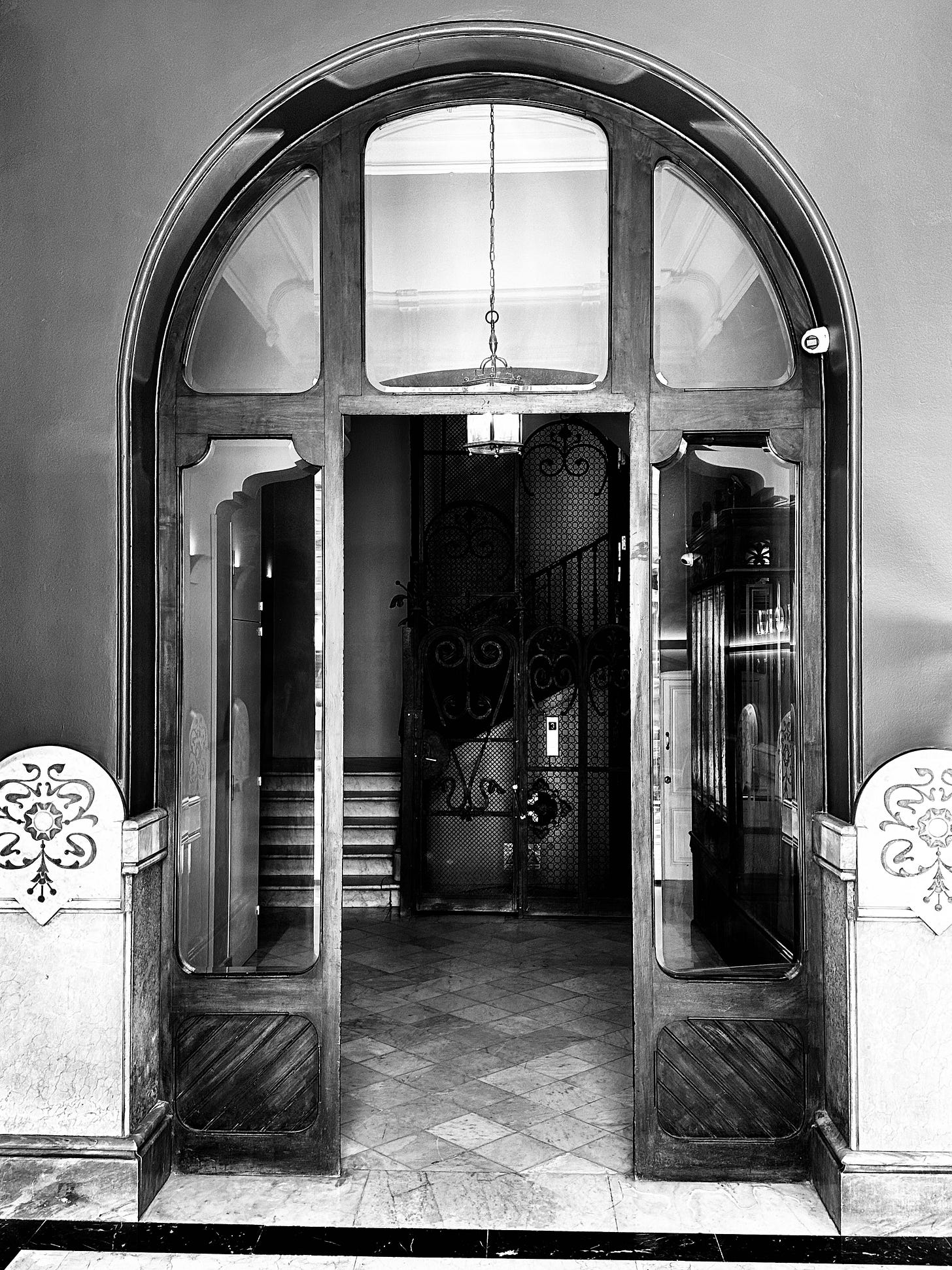 The composition is built on symmetry and depth. The wide, towering arched doorway, crafted from rich wood and clear glass, acts as a welcoming frame. The decision to use black and white processing emphasises the sleek lines, the reflective quality of the glass, and the interplay of textures: the smooth marble, the patterned floor tiles, and the intricate, shadowy wrought-iron gate that acts as a second, protective layer.