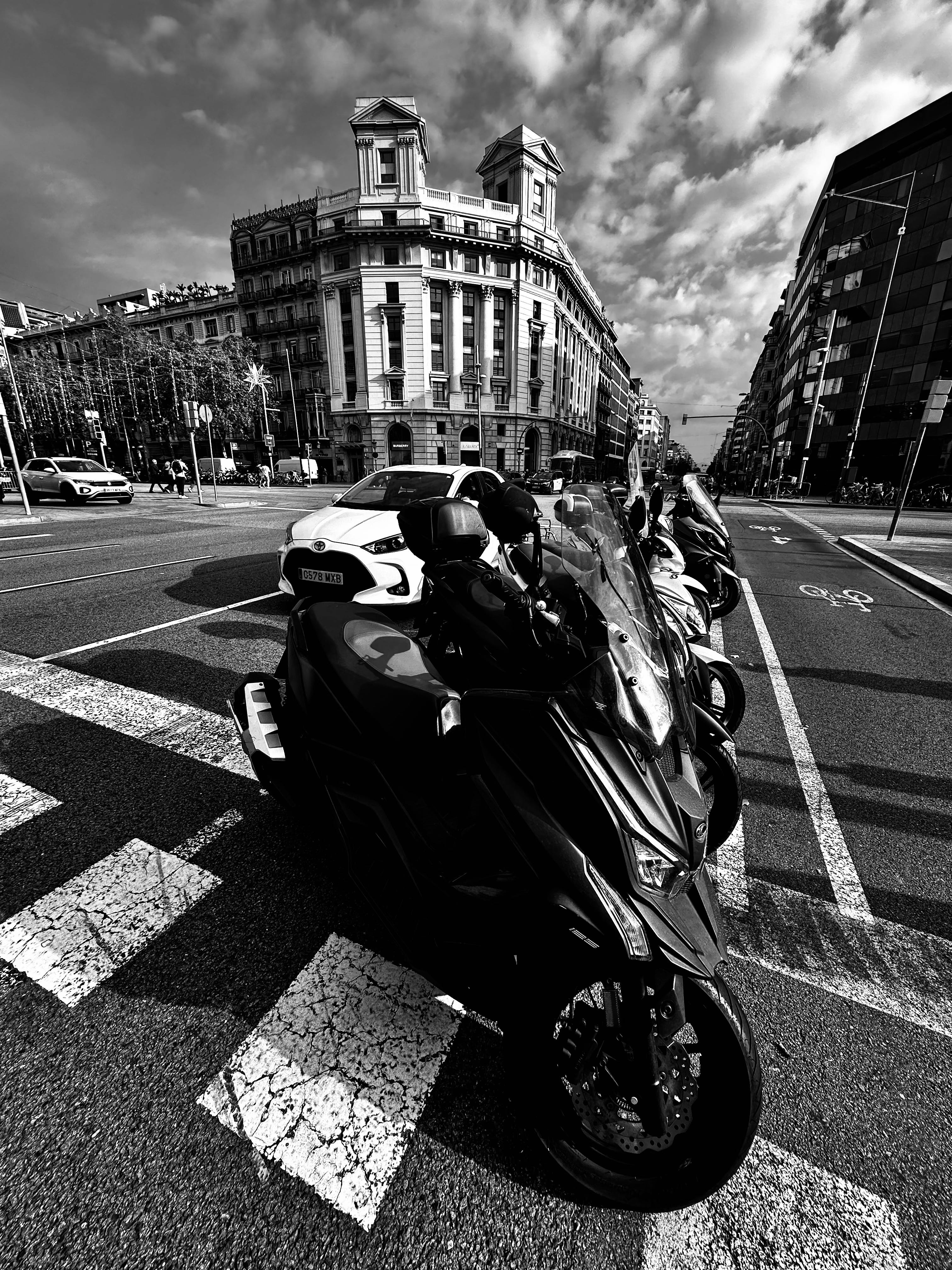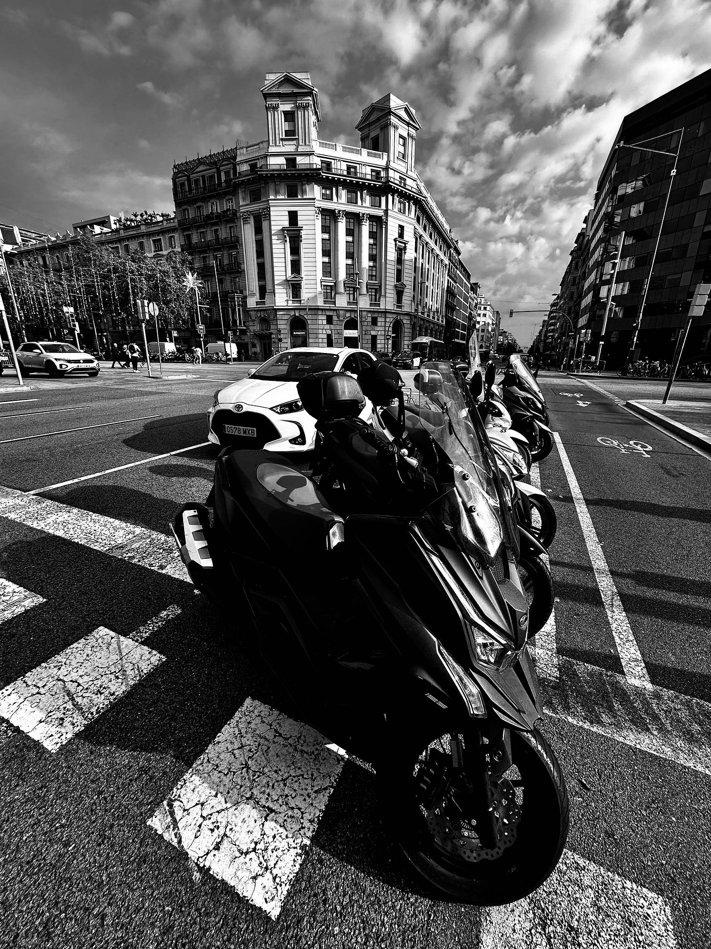 Barcelona is a city of elegant contrasts, and this photograph perfectly frames the energy of its daily rhythm. The dominant feature in the foreground is the sleek, dark silhouette of a scooter, an omnipresent symbol of speed, mobility, and essential urban life in the city. The scooter is placed right on the cracked zebra crossing, its front wheel bisecting the frame, creating a sense of immediate, forward motion.