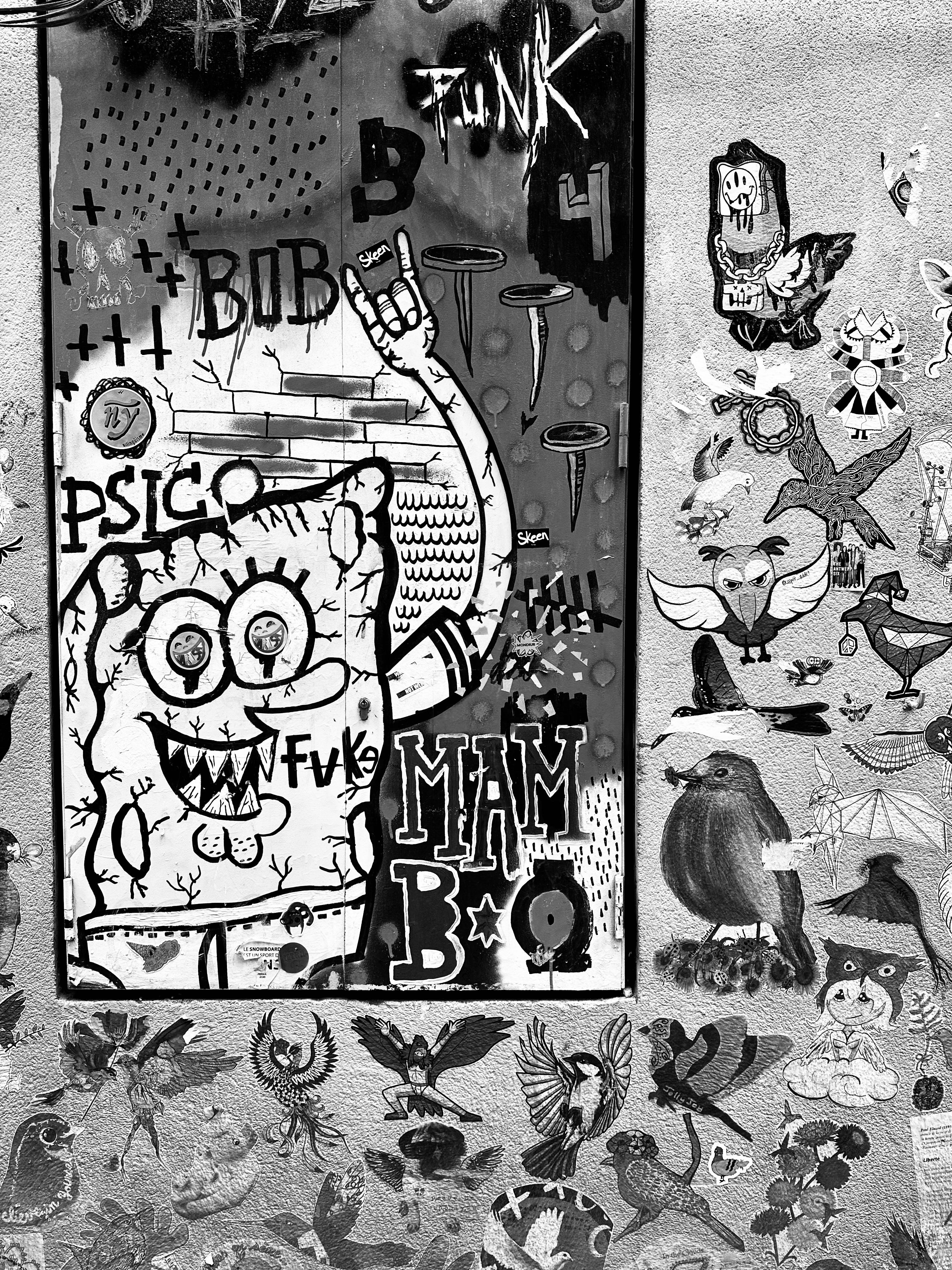 Barcelona, a city celebrated for its vibrant culture and artistic flair, often reveals its truest colours even in shades of grey. This dynamic monochrome photograph captures a lively section of a wall adorned with an eclectic mix of street art and pasted imagery, creating a fascinating visual narrative.