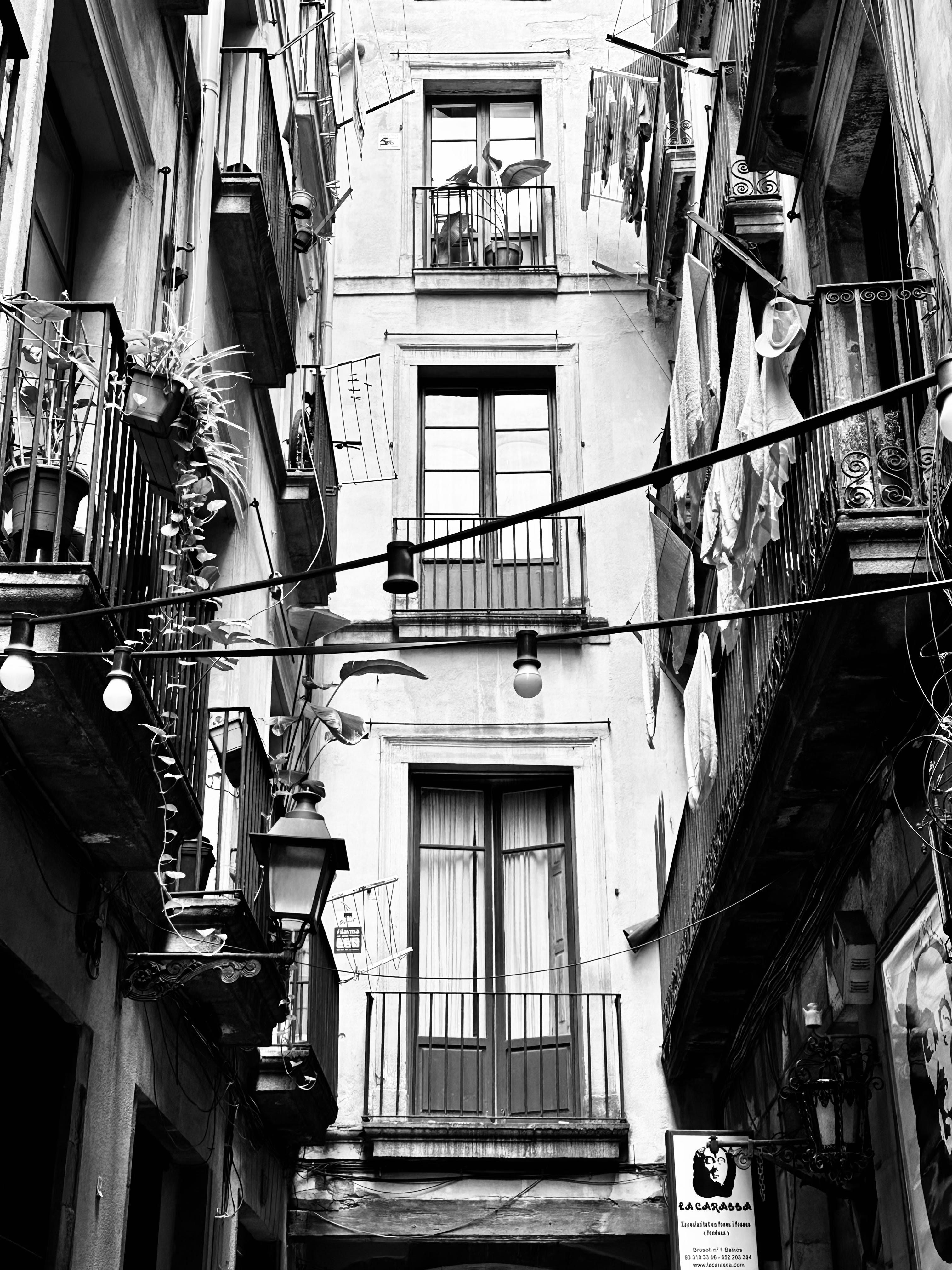 This captivating black and white photo looks up a narrow alley in Barcelona, revealing a vertical slice of city life. The image is filled with the authentic details of European architecture: tiered balconies, strings of hanging laundry, and potted plants. It captures the essence of a lively, lived-in city, where history and everyday routines coexist in …