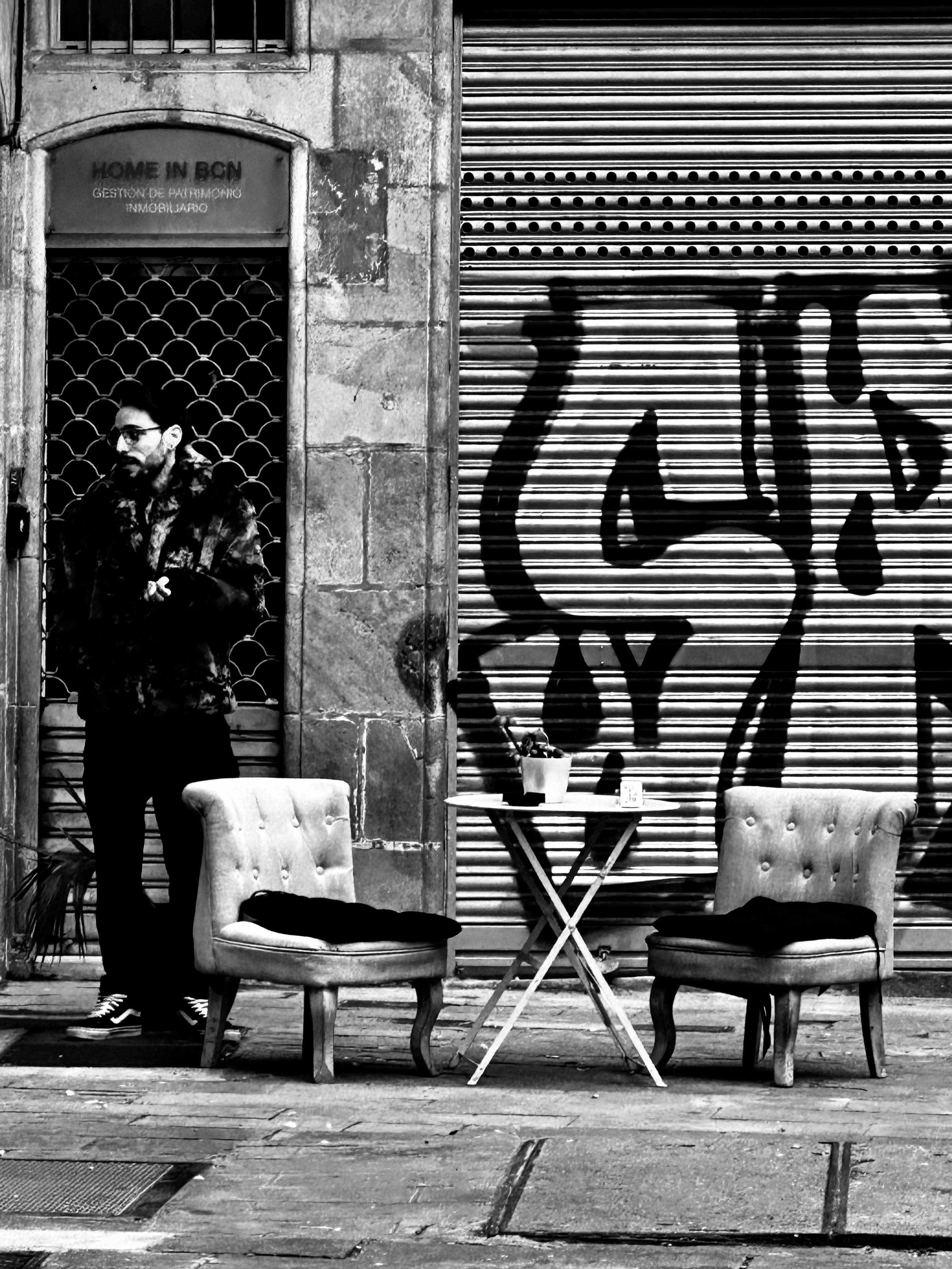The composition is centred on a stark juxtaposition: two elegant, tufted upholstered armchairs and a simple cafe table set against a heavy, industrial metal shutter. The shutter itself is covered in bold, graphic graffiti, providing a gritty, modern backdrop to the classic furniture. To the left, a man stands in the doorway of “Home in BCN,” his presence adding a layer of candid, human narrative to the scene.