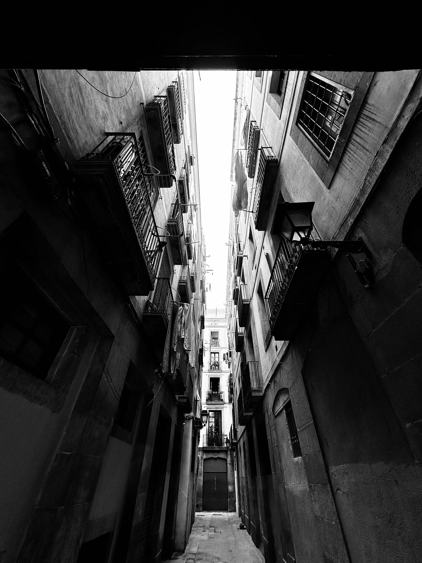 Barcelona, a city celebrated for its vibrant culture and artistic flair, often reveals its truest colours even in shades of grey. This striking monochrome photograph presents a dramatic, upward-looking perspective into a narrow Barcelona alleyway, emphasizing the towering presence of its historic buildings.